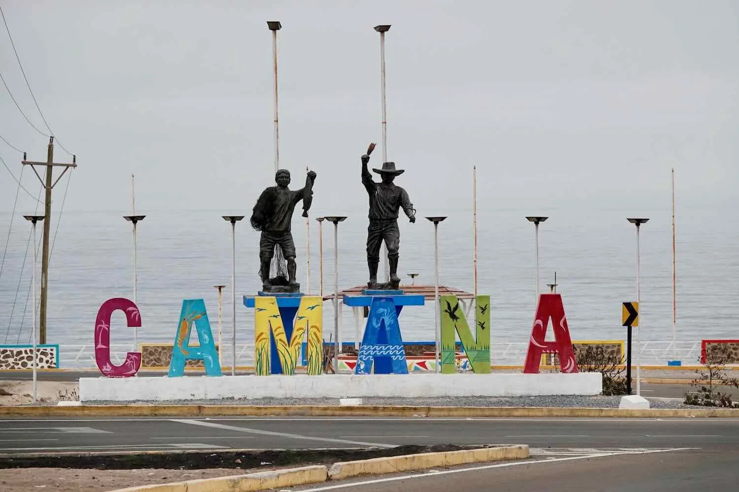 A sign at the bottom of the descent welcomed us to the coastal community of Camaná. The gray, Pacific Ocean was just barely visible, less than a quarter mile away. Camaná, Pan-American Highway, Arequipa Department, Peru. Copyright © 2019-2026 Pedals and Puffins.