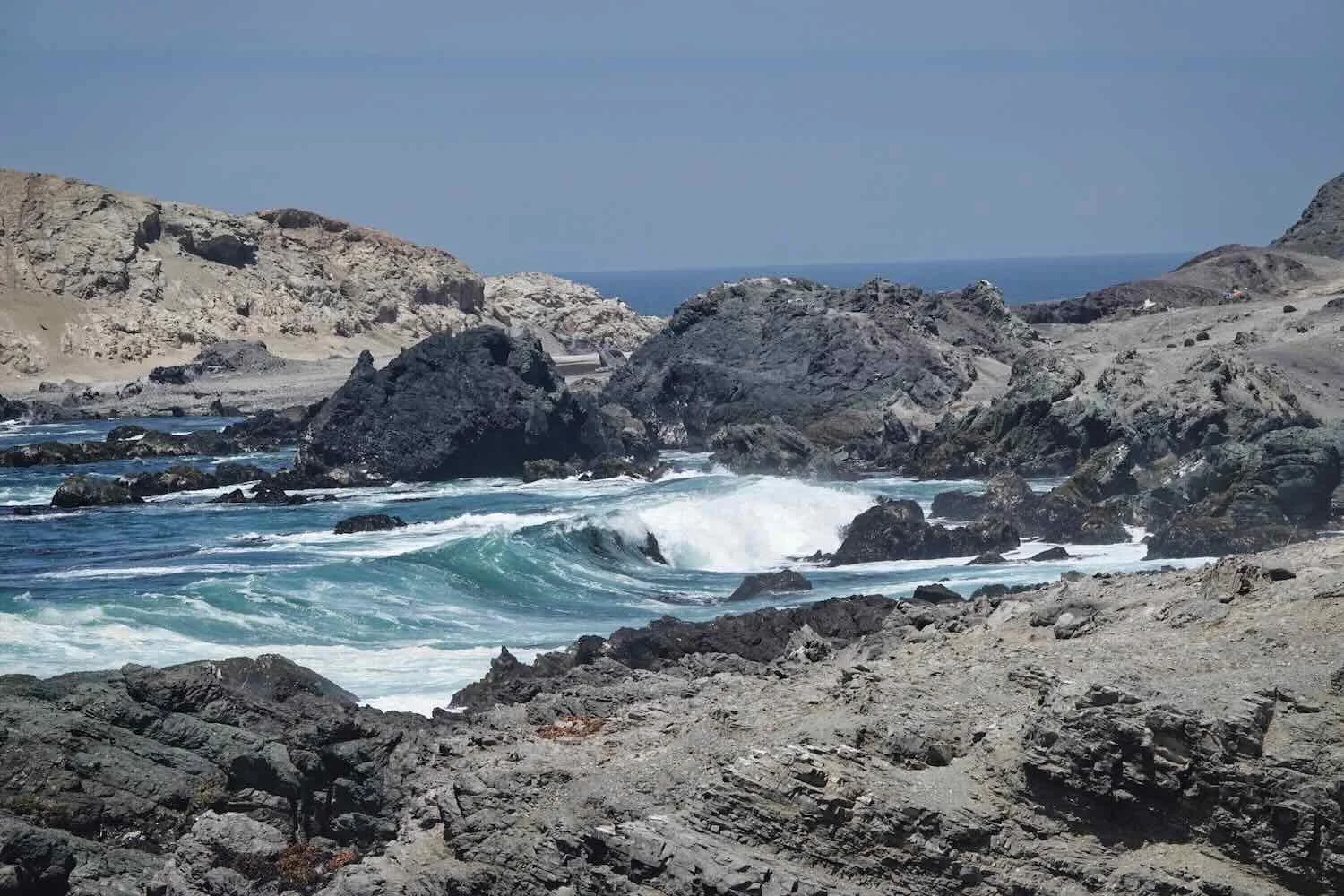Big waves crashed against the rocks. Pan-American Highway, Arequipa Department, Peru. Copyright © 2019-2026 Pedals and Puffins.