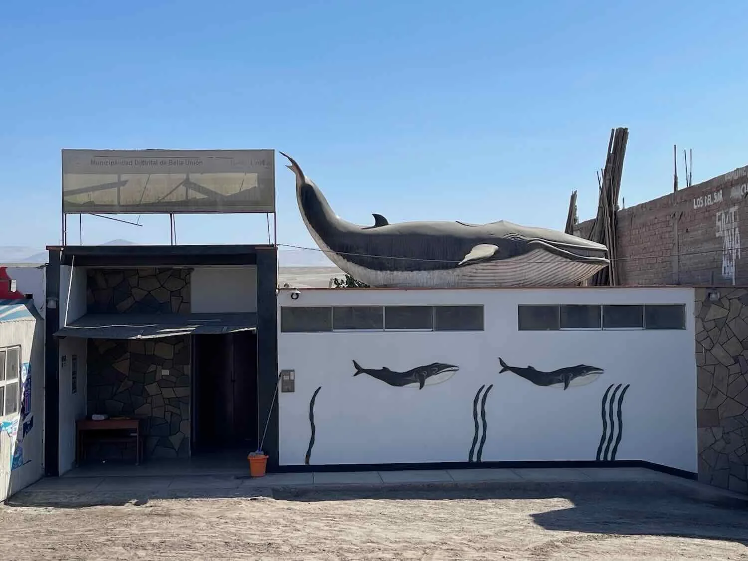 Whalebone fossils found near the village of Chaviña were another indicator that this desert was once under the ocean. The town celebrated this discovery by mounting a whale statue on top of its public restrooms. Chaviña, Pan-American Highway, Arequipa Department, Peru. Copyright © 2019-2026 Pedals and Puffins.