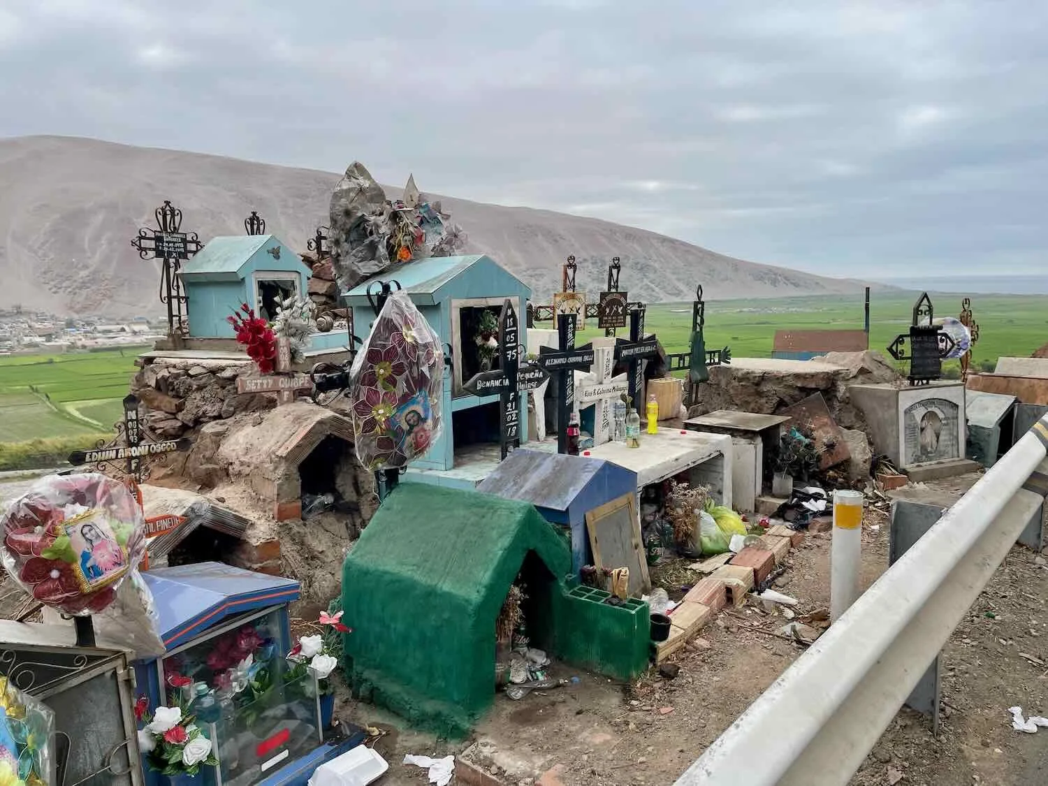 Large numbers of memorial shrines clustered along the edge of a curve, on the road up the Ocoña Cliffs. With heavy traffic, tight turns and a steep drop-off into the valley, this is one of the most deadly sections of road in Peru. Ocoña River Valley, Pan-American Highway, Arequipa Department, Peru. Copyright © 2019-2026 Pedals and Puffins.