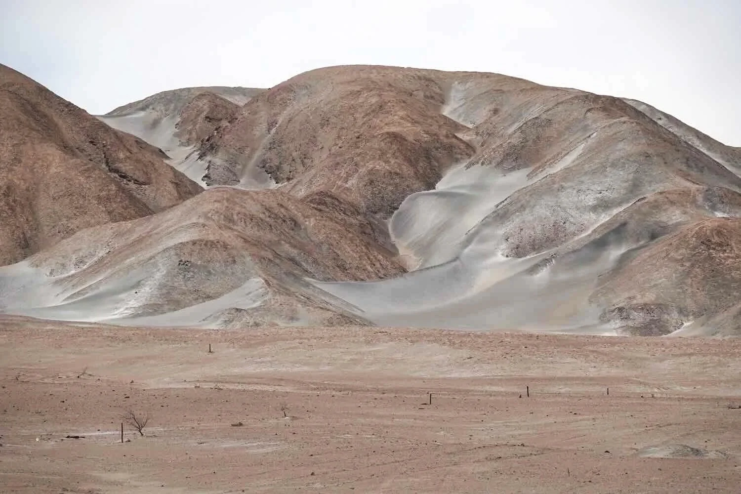 The wind-sculpted mountains were dusted with bright, white sand. What struck us the most was the nearly complete lack of vegetation. This place was bone dry. Near Cerro Verde Mine, Arequipa Department, Peru. Copyright © 2019-2026 Pedals and Puffins.