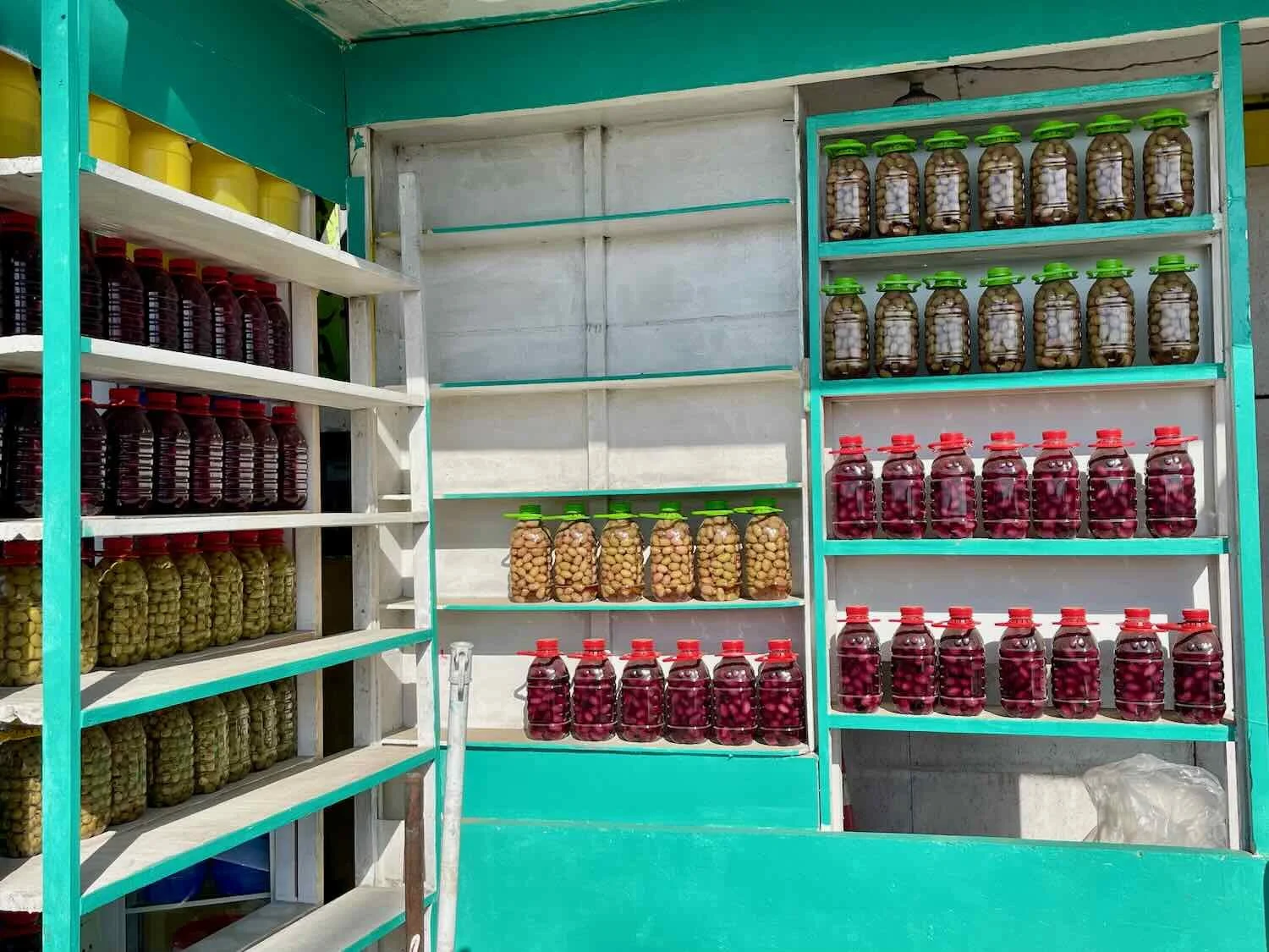 Each stall had shelves lined with locally-produced table olives, in every color imaginable. Yauca, Pan-American Highway, Arequipa Department, Peru. Copyright © 2019-2026 Pedals and Puffins.