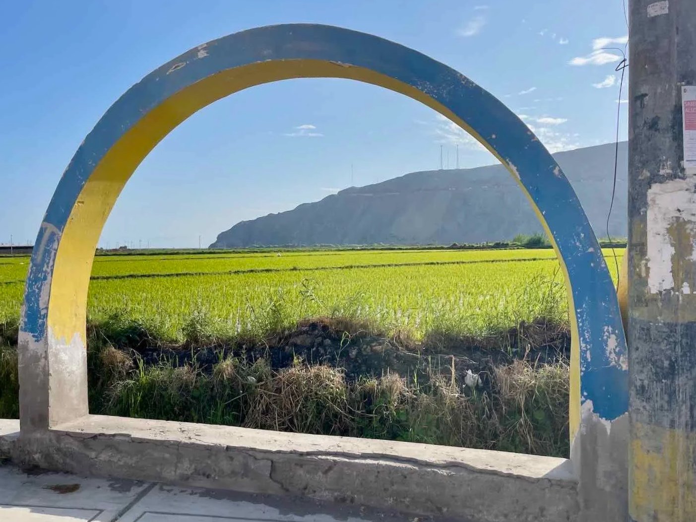 Like Camaná, the village of Ocoña (pop. 1,400) sat in a fertile river valley. As we rounded a bend in the highway, we were greeted with the sight of more, bright green fields of rice, glowing in the afternoon sun. A painted arch near the entrance to town framed a view of cultivated abundance. Nearby, a series of murals celebrated scenes related to rice farming including plowing, planting and harvesting. With so much rice, we were starting to appreciate how Peruvians managed to include a giant pile of rice on every plate of food, with every meal.