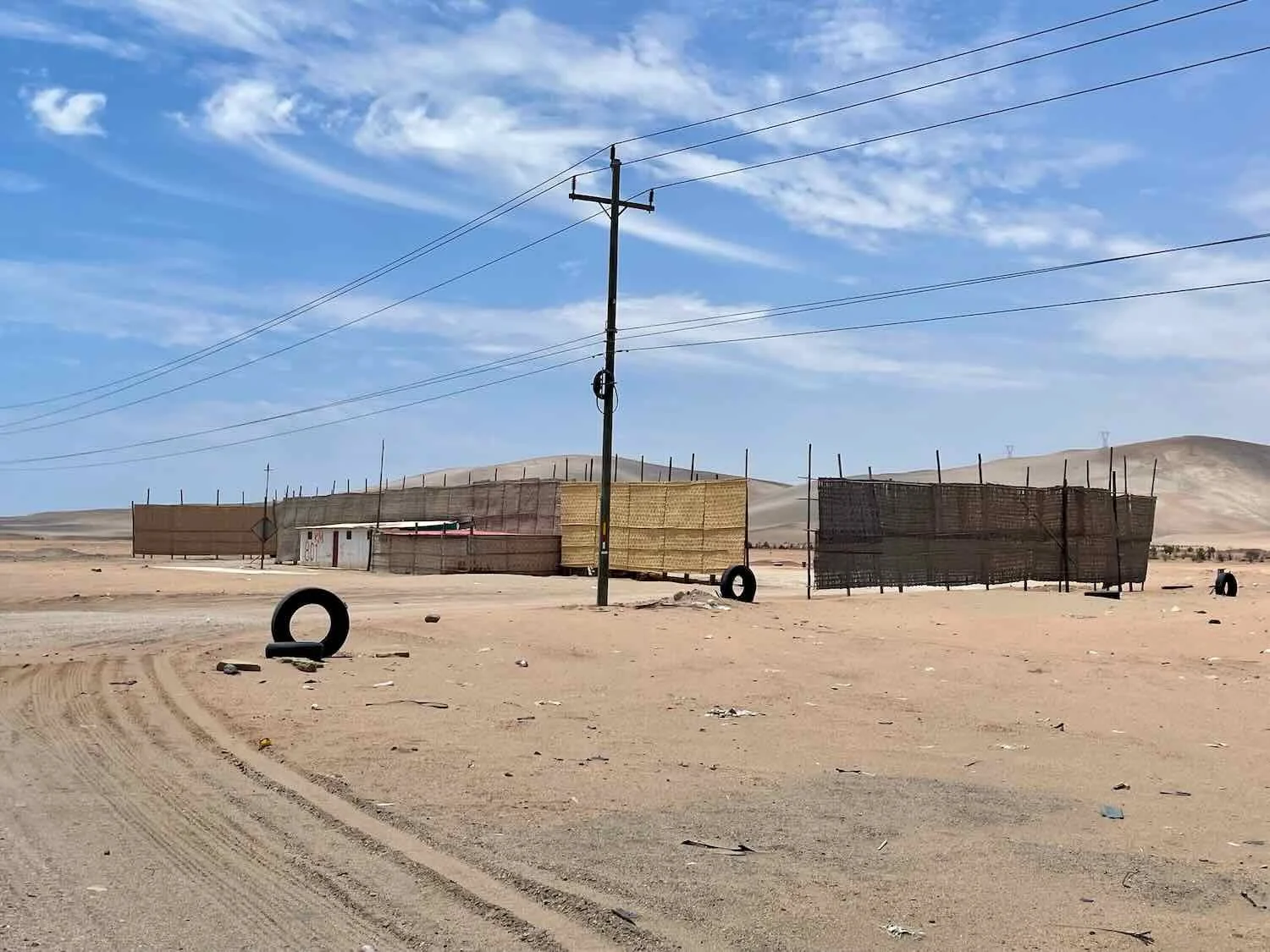 Up on the plateau the roadside was scattered with seemingly unused structures, surrounded by wind fences that were twice as tall as a person. There were no indications as to what these structures were used for. Near Caleta del Inca, Pan-American Highway, Arequipa Department, Peru. Copyright © 2019-2026 Pedals and Puffins.