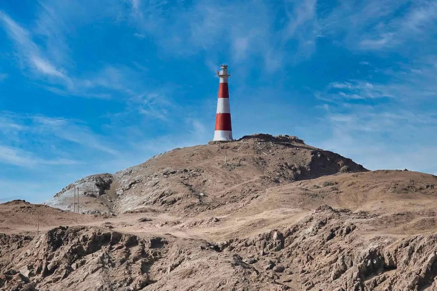 A lighthouse stood on top of a nearby headland, providing a splash of color in the sandy-brown desert. La Punta Lighthouse, Pan-American Highway, Arequipa Department, Peru. Copyright © 2019-2026 Pedals and Puffins.