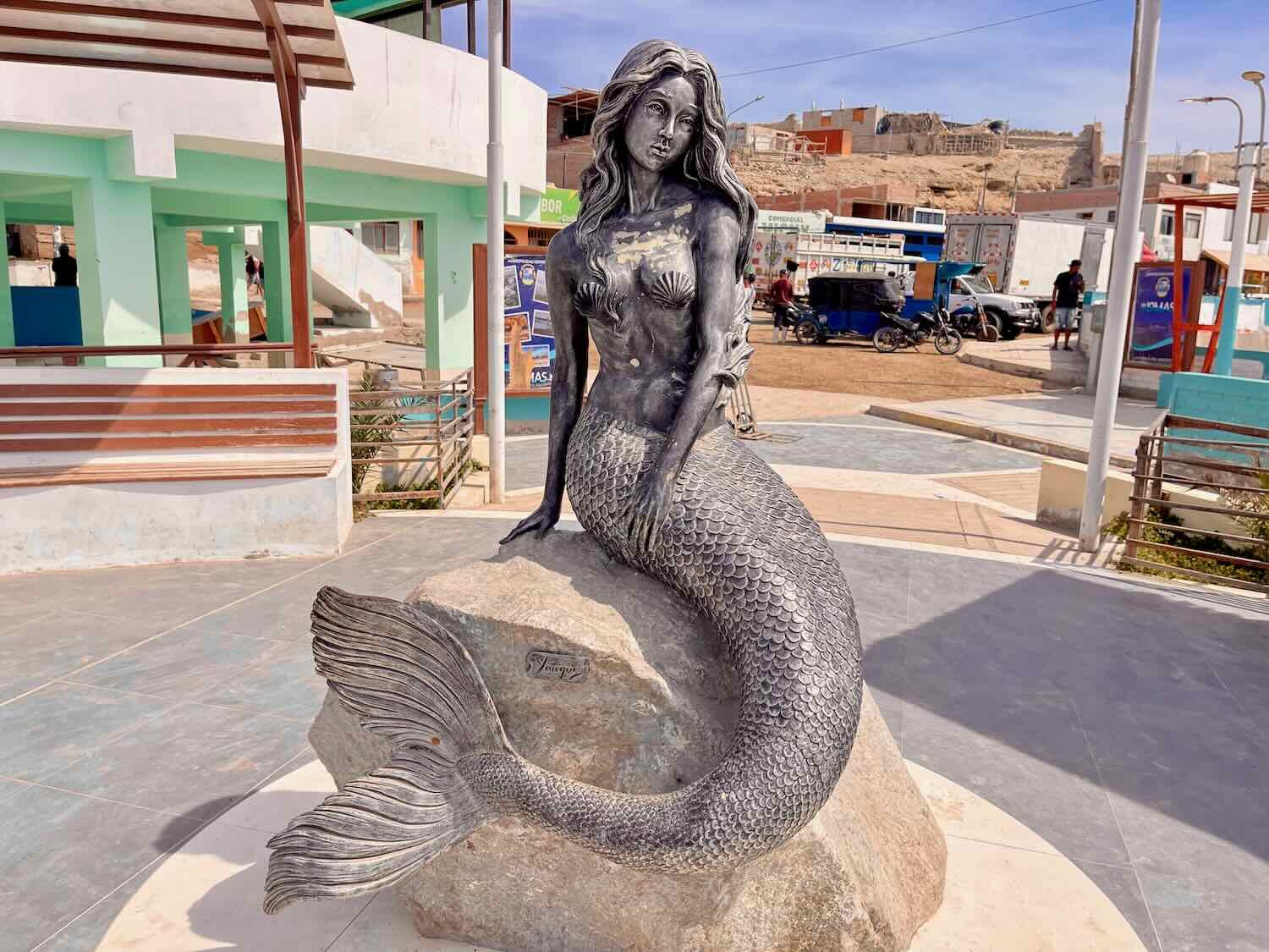 The waterfront docks hosted several statues, including this mermaid. Puerto de Lomas, Arequipa Department, Peru. Copyright © 2019-2026 Pedals and Puffins.