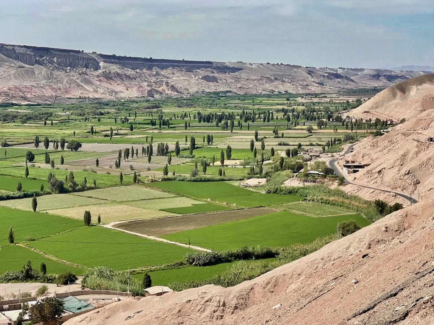 The next day’s ride began with an enjoyable, downhill romp through the desert. Initially the surrounding hills were completely barren. It was only when we reached the rim of a river valley that we saw, again, the life-giving power of water in the desert. The valley walls were nothing but dun-colored sand. Yet the valley floor was completely transformed by irrigation, into a patchwork of lush agricultural fields. There even were some trees scattered among the fields. It was a jarring contrast.