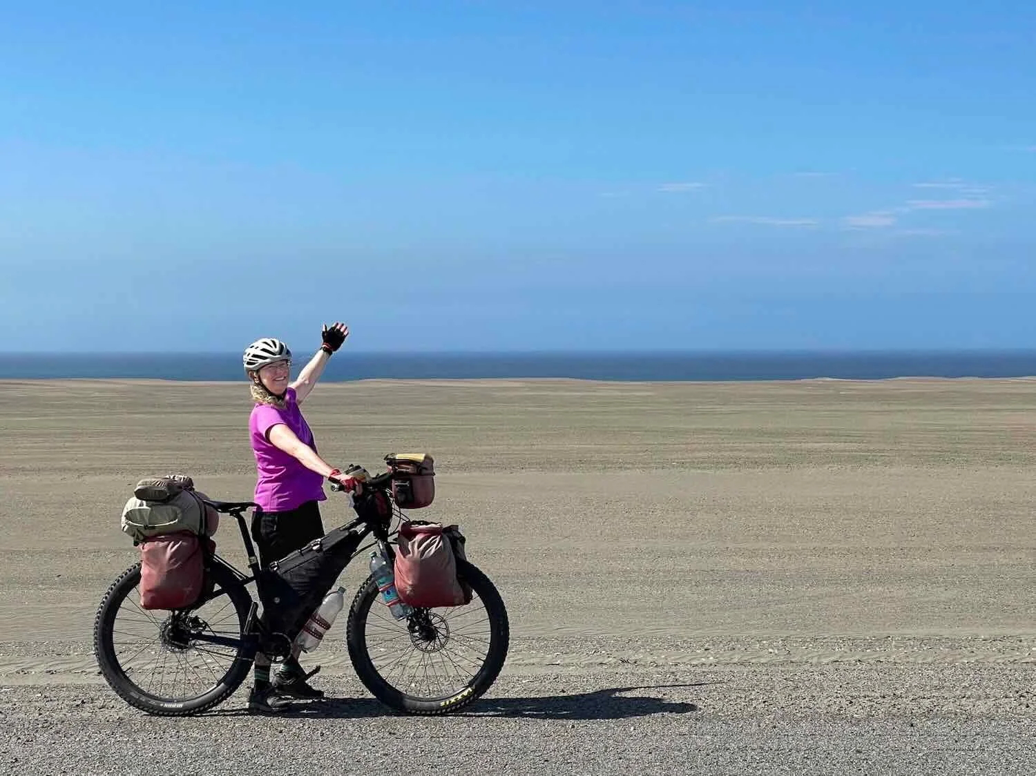 The ride from Yauca to Puerto de Lomas began with a cruise along a low, flat, almost featureless plain. We were glad to cycle that stretch of road in the morning, before the wind picked up - which would have surely pelted us with sand. The Pacific Ocean is in the distance. Near Yauca, Pan-American Highway, Arequipa Department, Peru. Copyright © 2019-2026 Pedals and Puffins.