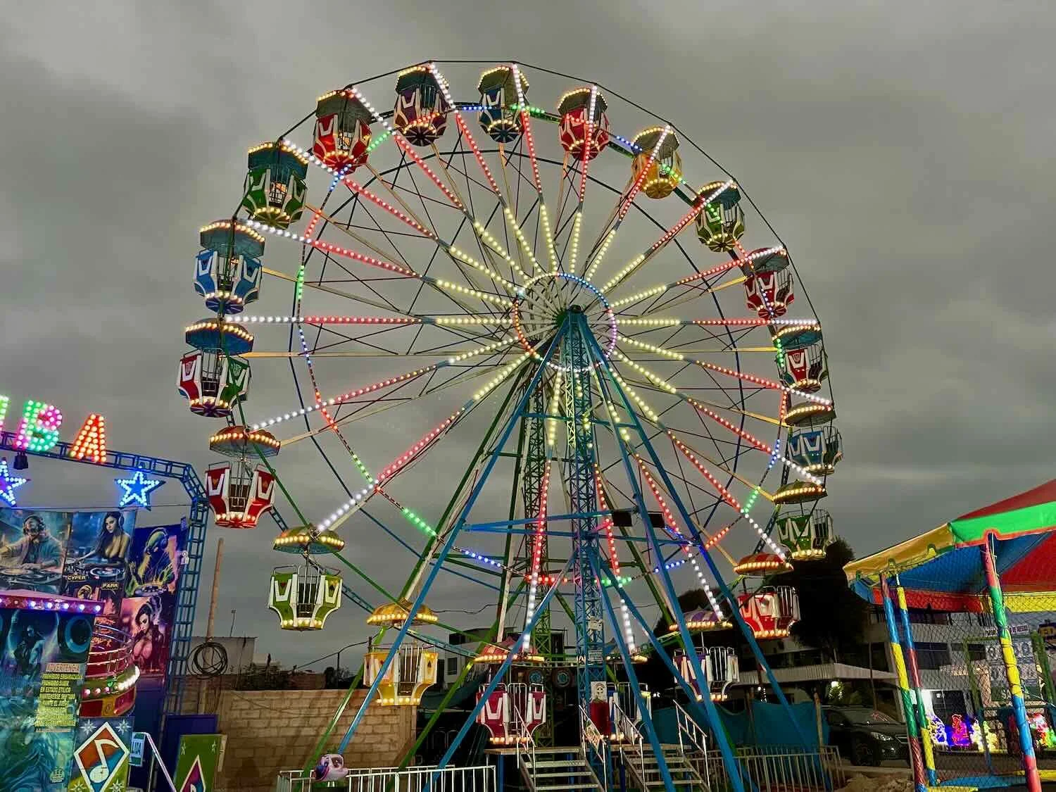 While walking around town after dinner, we were drawn to the colorful, flashing lights of this Ferris wheel. It was set up at a traveling carnival, in one of the town’s plazas. Camanà, Pan-American Highway, Arequipa Department, Peru. Copyright © 2019-2026 Pedals and Puffins.
