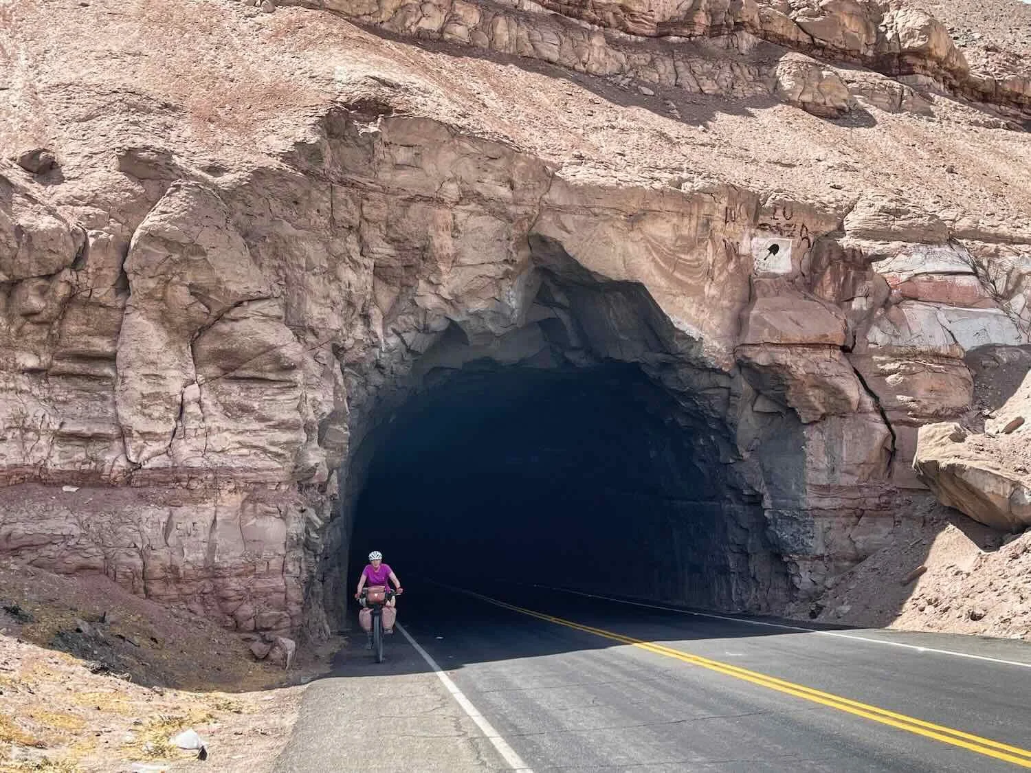 Passing through a tunnel on the climb out of the Vitor River Valley. W of Vitor, Pan-American Highway, Arequipa Department, Peru. Copyright © 2019-2026 Pedals and Puffins.