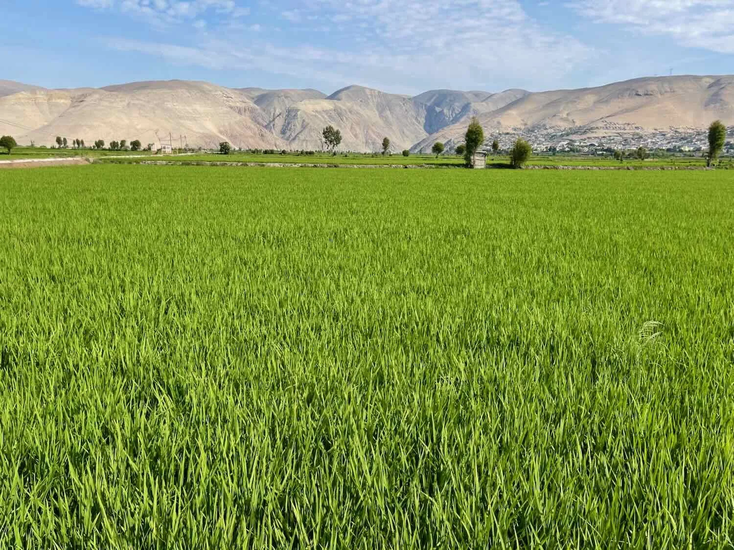 Great swaths of land surrounding town were covered with a blanket of bright-green rice. Camanà River Valley, Pan-American Highway, Arequipa Department, Peru. Copyright © 2019-2026 Pedals and Puffins.