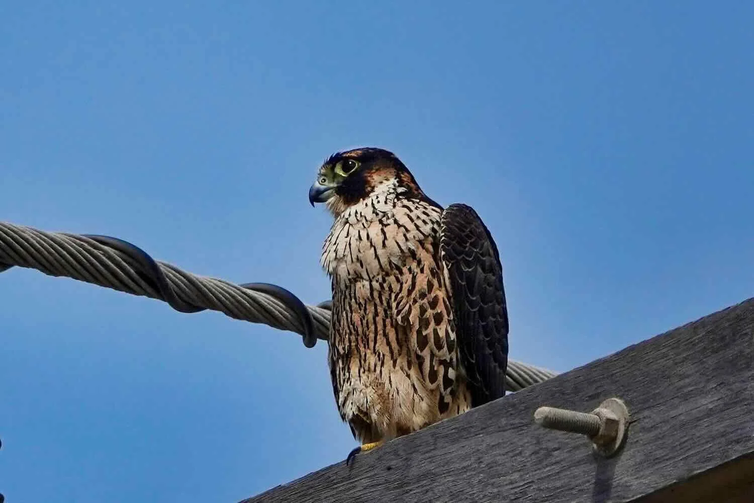 Near the edge of the fields, where the desert began, a Peregrine Falcon rested on a utility pole. Jaguey, Pan-American Highway, Arequipa Department, Peru. Copyright © 2019-2026 Pedals and Puffins.