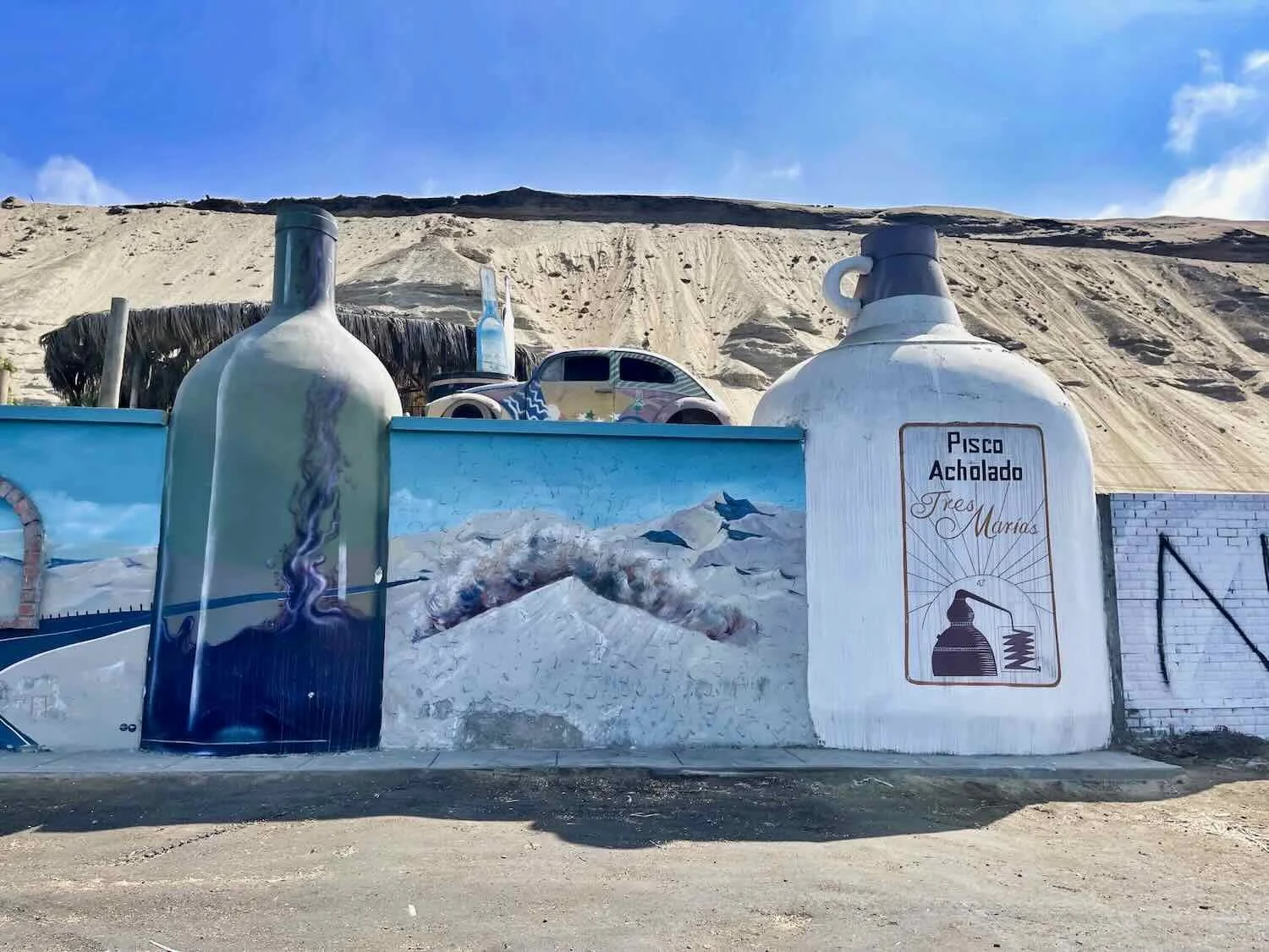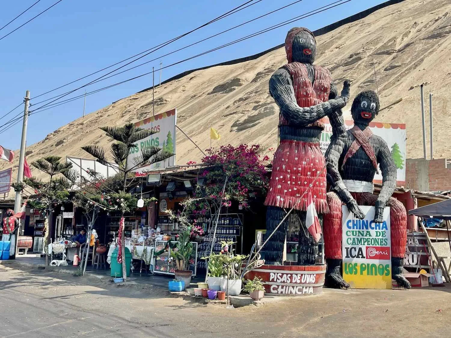 It was common to see dozens of roadside shops clustered together, all selling the same thing. In this case, it was no surprise that the main items for sale were gifts and drinks made from grapes - especially pisco, the national liquor. Near Chincha, Pan-American Highway, Ica Department, Peru. Copyright © 2019-2026 Pedals and Puffins.