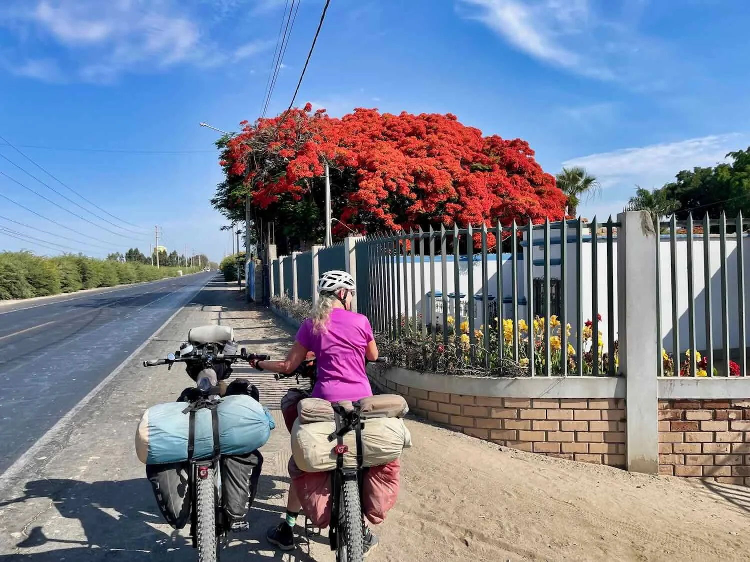 Getting ready to depart from our hotel in Ocucaje. It was summer, and the royal poinciana trees were in full bloom. Ocucaje, Pan-American Highway, Ica Department, Peru. Copyright © 2019-2026 Pedals and Puffins.