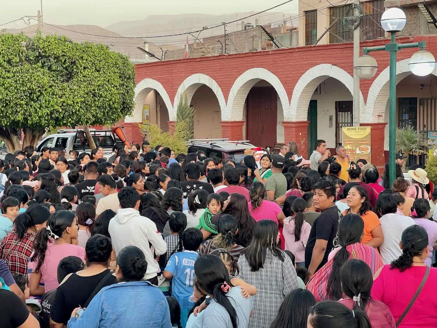 When Santa Claus appeared, everyone who had been waiting in the town plaza rushed towards him in an excited crowd. Santa’s red cap is visible just to the right of the vehicle at the top center of the photo. Palpa, Ica Department, Peru. Copyright © 2019-2026 Pedals and Puffins.