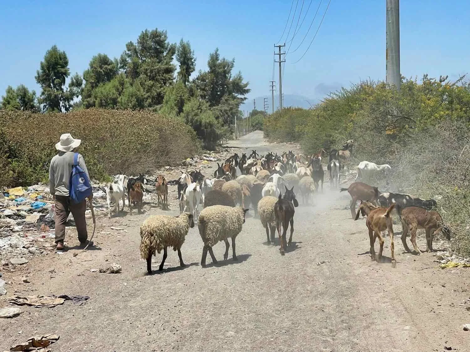 Stuck behind a herd of sheep and goats on the “shortcut” into the town of Pisco. Ica Department, Peru. Copyright © 2019-2026 Pedals and Puffins.
