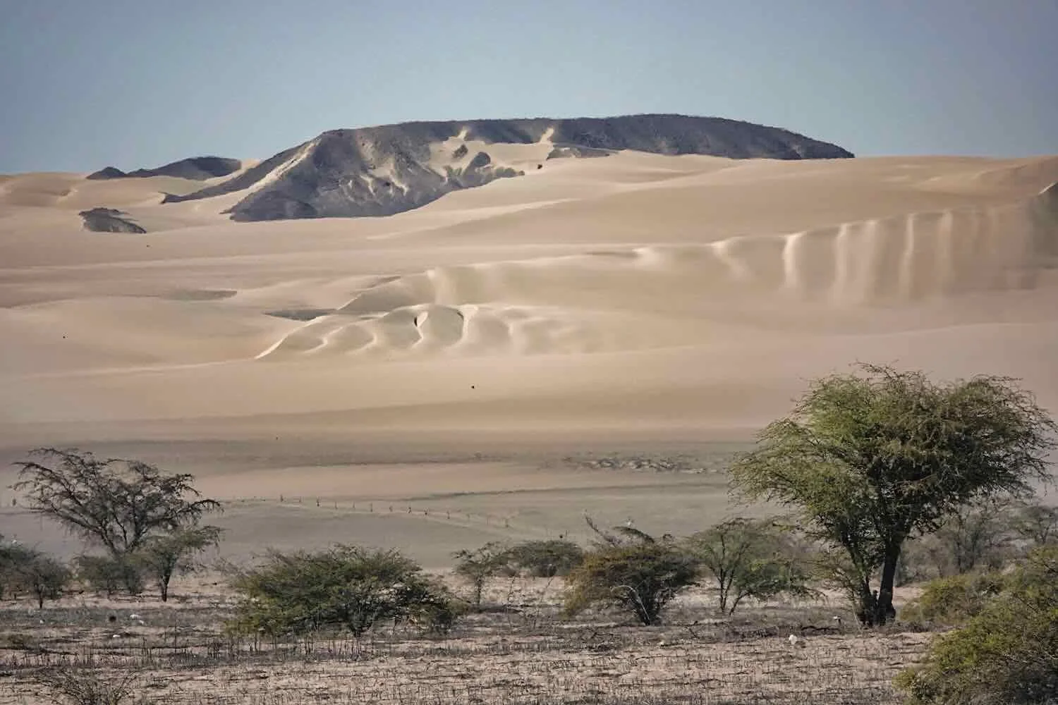 As we descended towards the coast, desert mountains rose on both sides of the highway wreathed in enormous sand dunes. It was nice to see some thorn trees start to appear along the road. The “California Desert”, W of Ica, Pan-American Highway, Ica Department, Peru. Copyright © 2019-2026 Pedals and Puffins.
