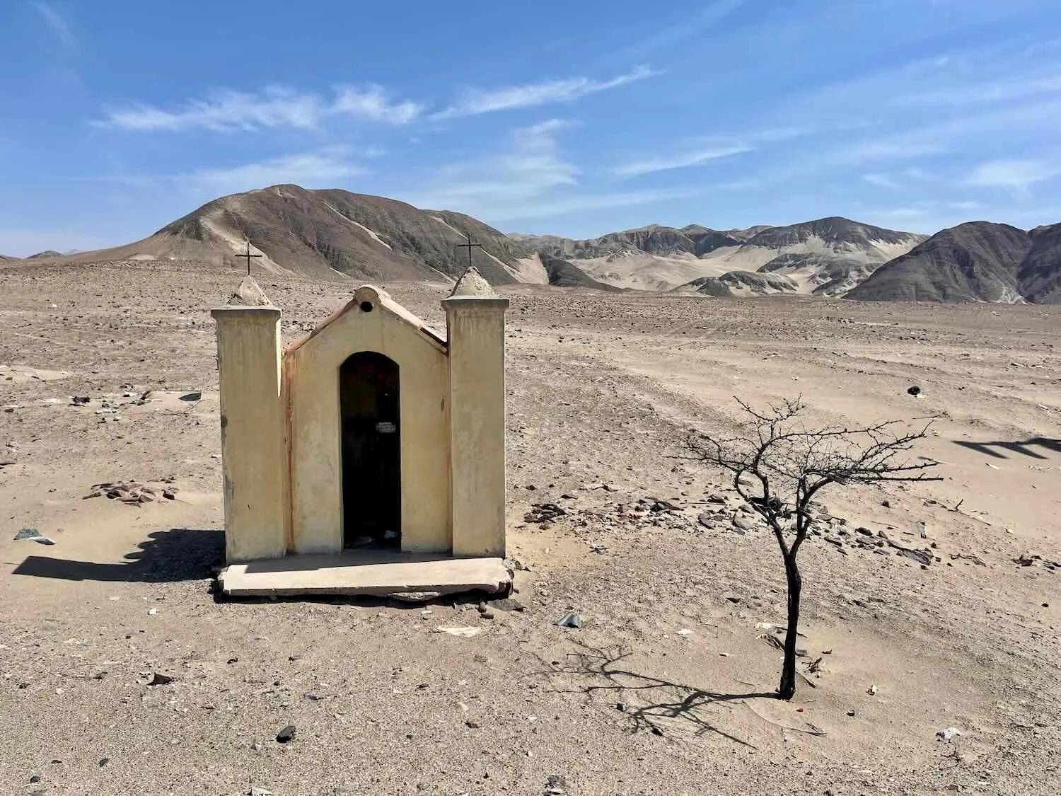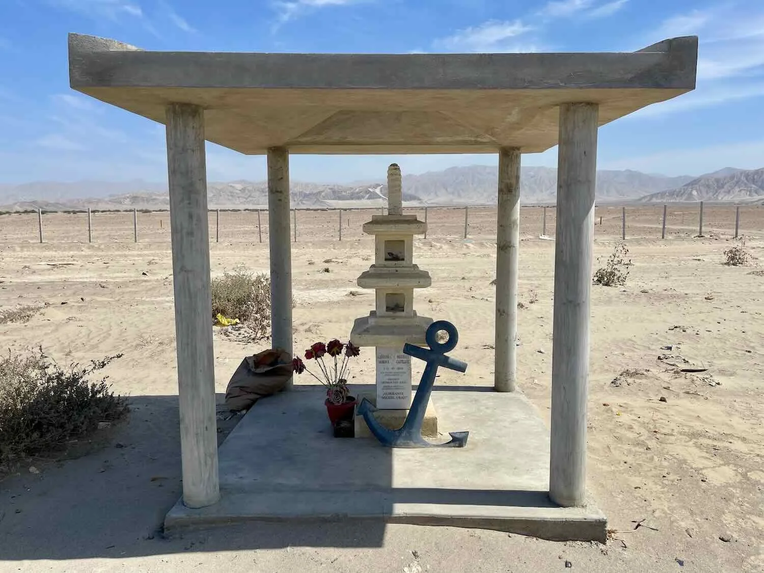Roadside Shrine. Pampa de Huayuri, Pan-American Highway, Ica Department, Peru. Copyright © 2019-2026 Pedals and Puffins.