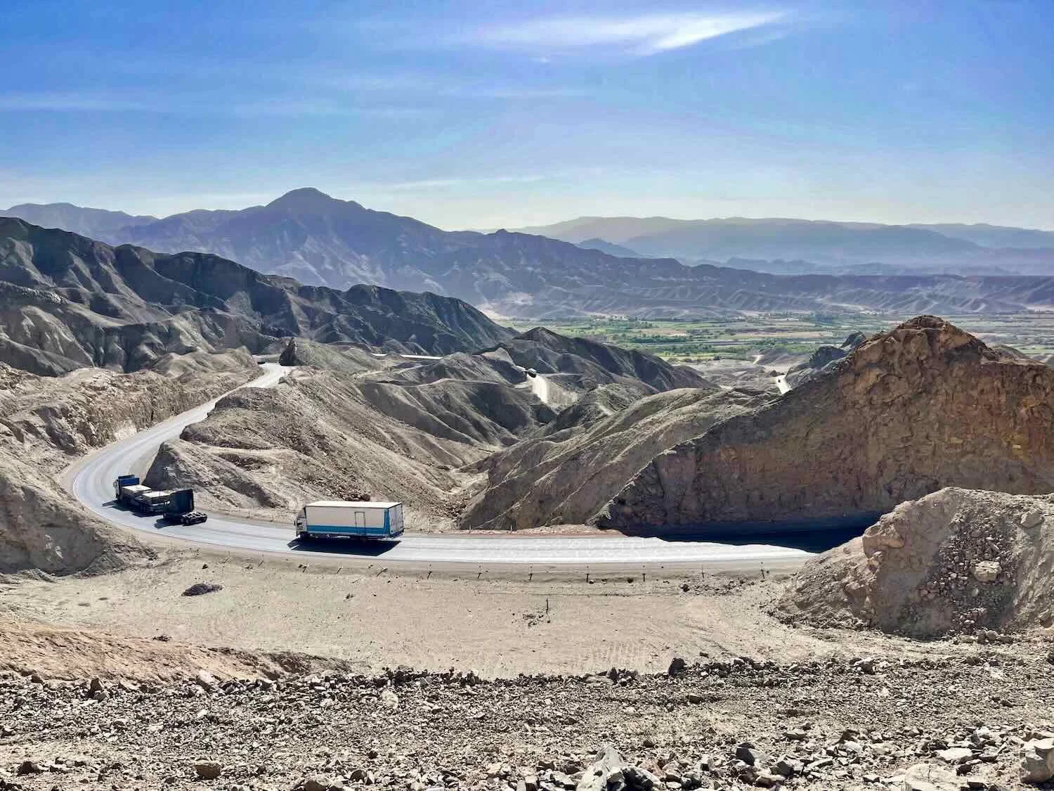 This is where we encountered the truck transporting the wind turbine blade. You can see a few of the tight, hairpin turns that the truck and blade had to maneuver around. The agricultural valley that we had ridden past in the early morning can be seen in the distance. N of Río Grande, Pan-American Highway, Ica Department, Peru. Copyright © 2019-2026 Pedals and Puffins.