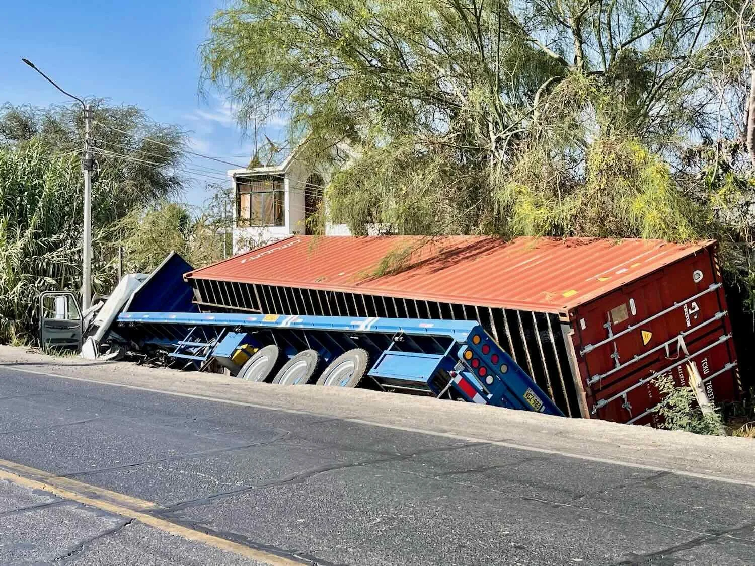 This was the second truck-in-a-ditch that we had seen since entering Peru. It was easy to understand how an accident like this could happen, if the truck tried to weave around stopped traffic by using the narrow road margin - which was something we witnessed a lot on this stretch of road. S of Ica, Pan-American Highway, Ica Department, Peru. Copyright © 2019-2026 Pedals and Puffins.