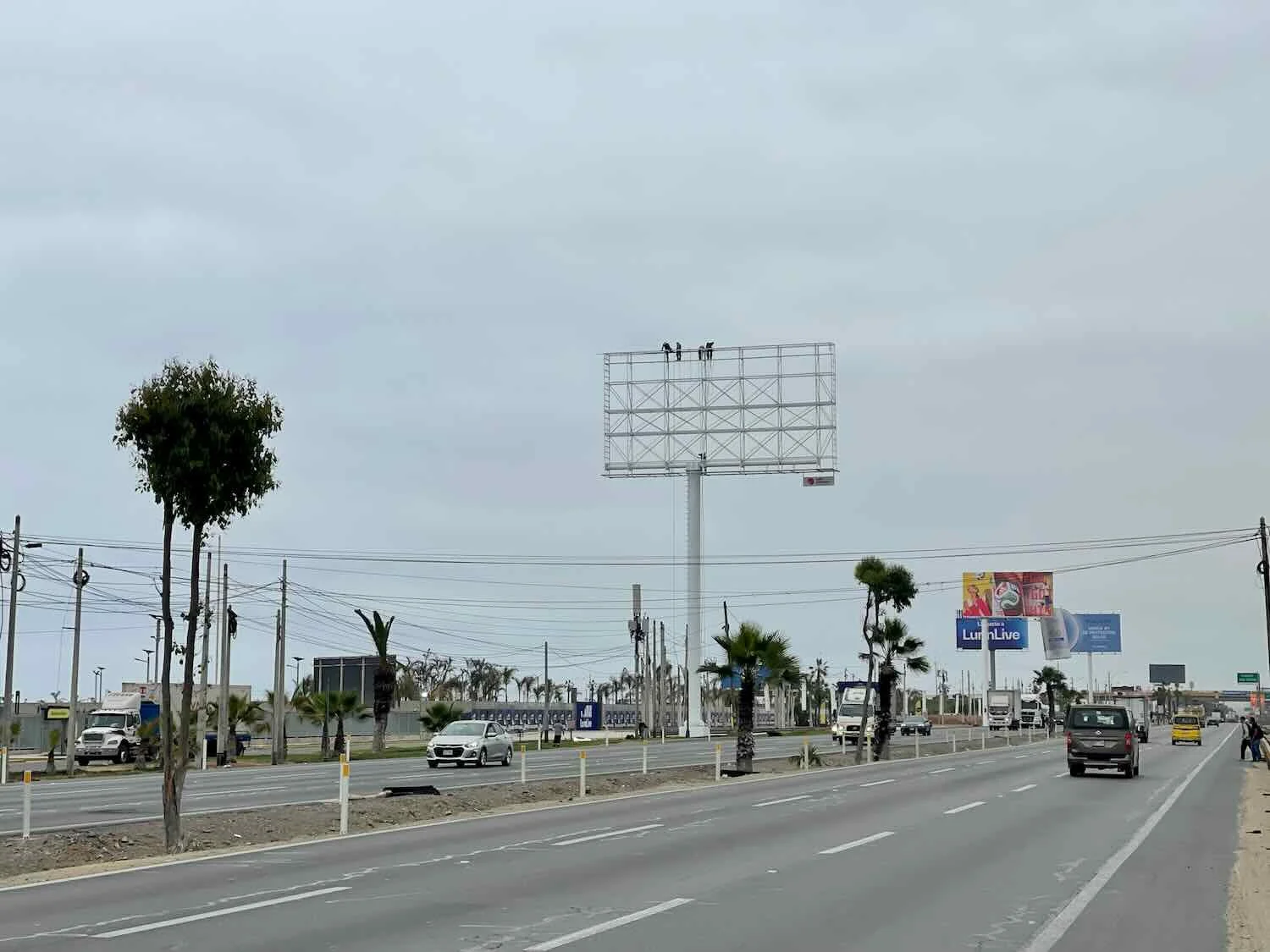 On our way into Lima we cycled for more than an hour through sprawling, commercial areas on the shoulder of a big highway. The sight of several guys working way up high, on the top of a roadside billboard frame (small black spots in this photo), stopped us in our tracks. It looked like a pretty dangerous job. Lurín, Pan-American Highway, Lima Department, Peru. Copyright © 2019-2026 Pedals and Puffins.
