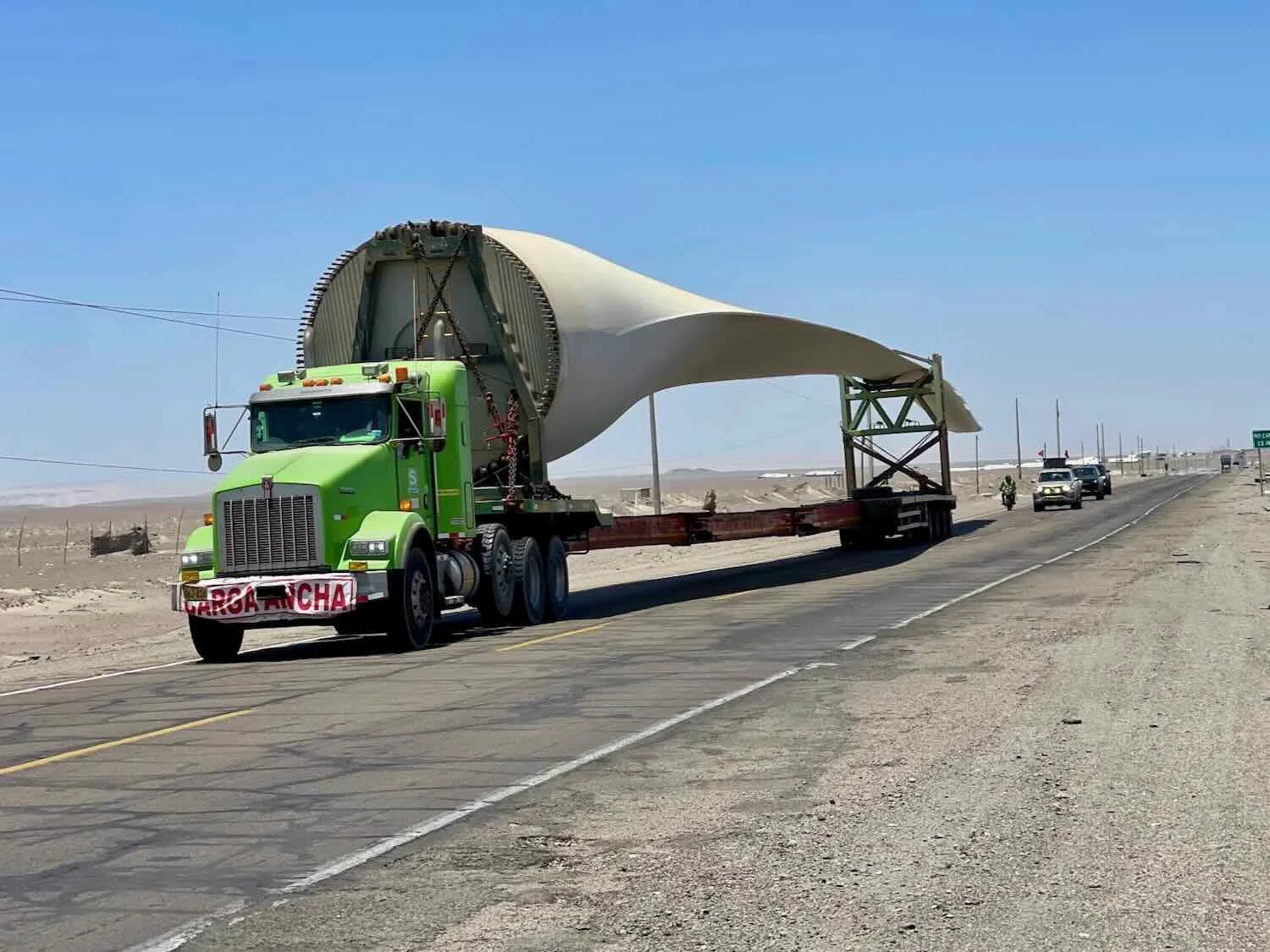 This truck was just one of several that we saw transporting industrial turbine blades down the highway. The presence of multiple storage facilities for blades along the road suggested there was a lot of new wind power capacity being built in this part of the country. Pampa de Huayuri, Pan-American Highway, Ica Department, Peru. Copyright © 2019-2026 Pedals and Puffins.