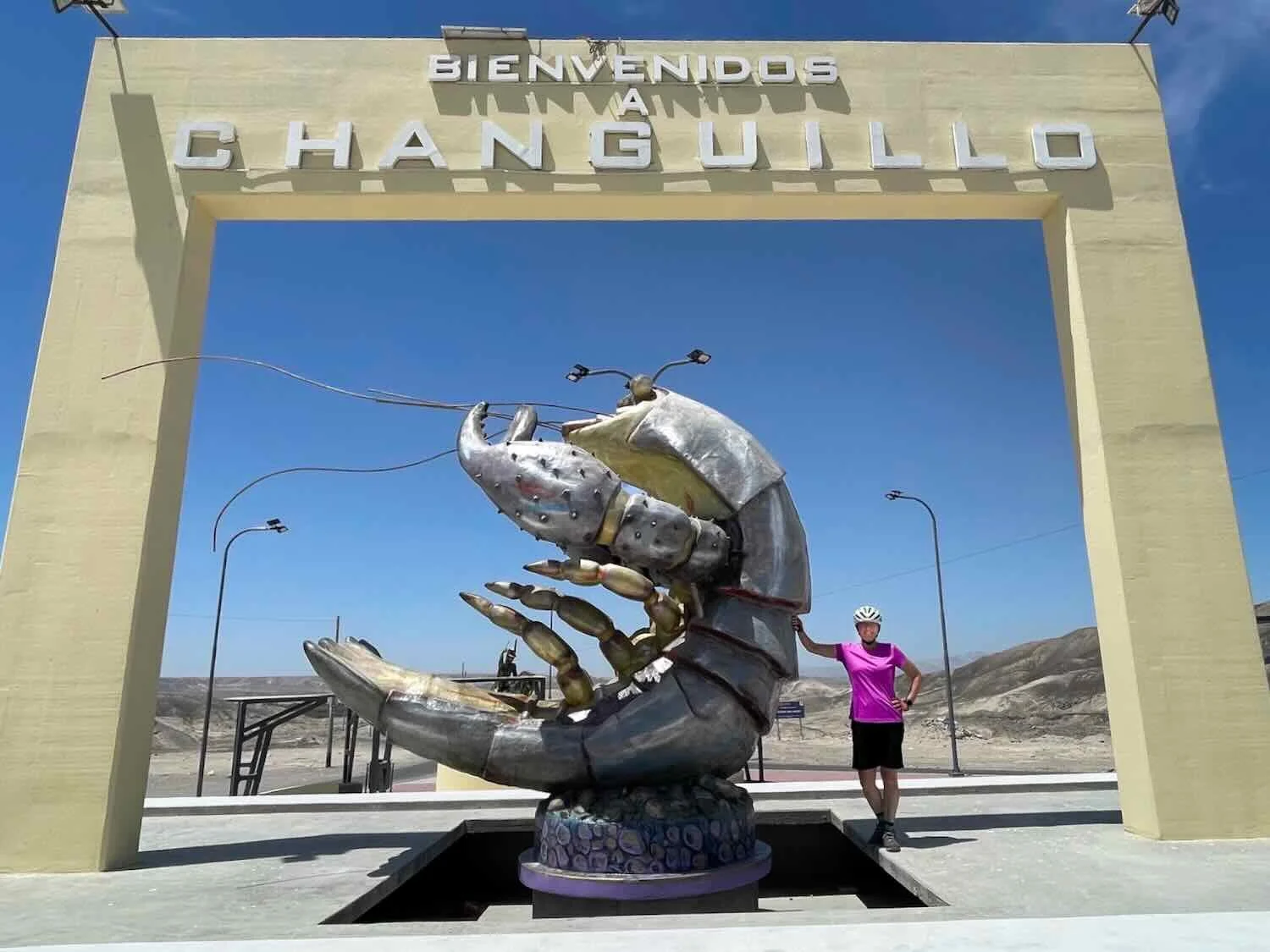 Posing with the town mascot (a changallo shrimp). Changuillo, Pan-American Highway, Ica Department, Peru. Copyright © 2019-2026 Pedals and Puffins.