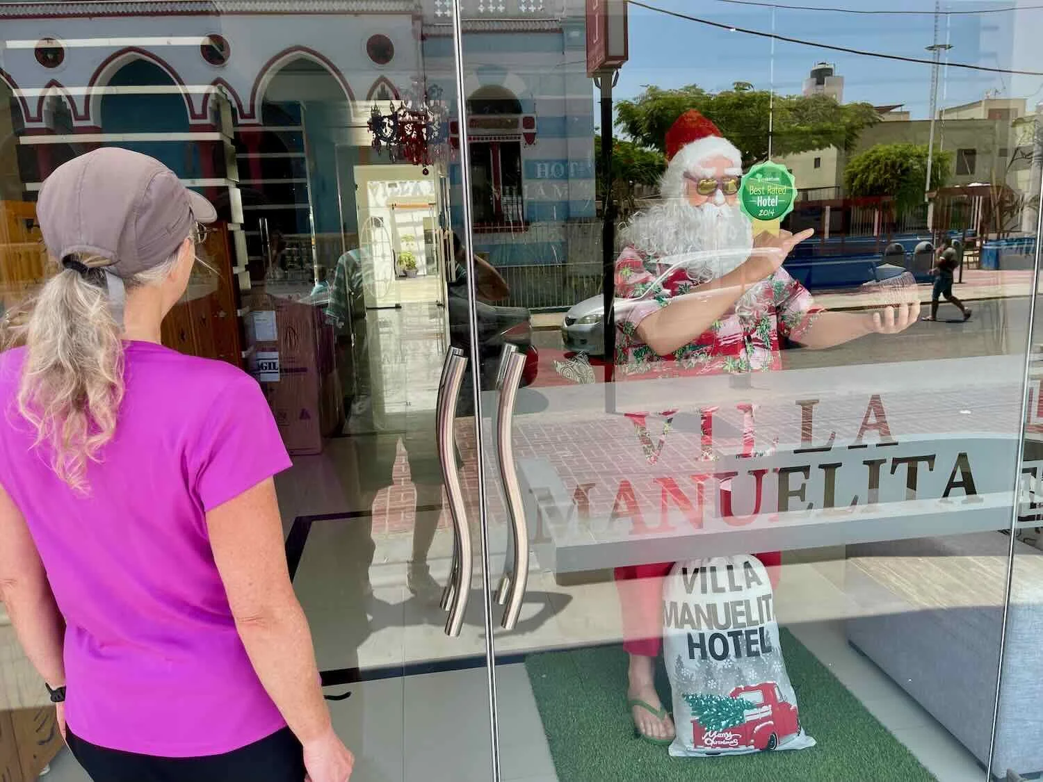 When we finally arrived at the hotel in Pisco it took us a few minutes to rouse someone to let us in - a fairly common challenge at these small town hotels. It was normal for the doors to be locked while the receptionist was away cleaning rooms or running errands. At least Santa Claus (dressed for a beach holiday) was there to greet us. Pisco, Ica Department, Peru. Copyright © 2019-2026 Pedals and Puffins.