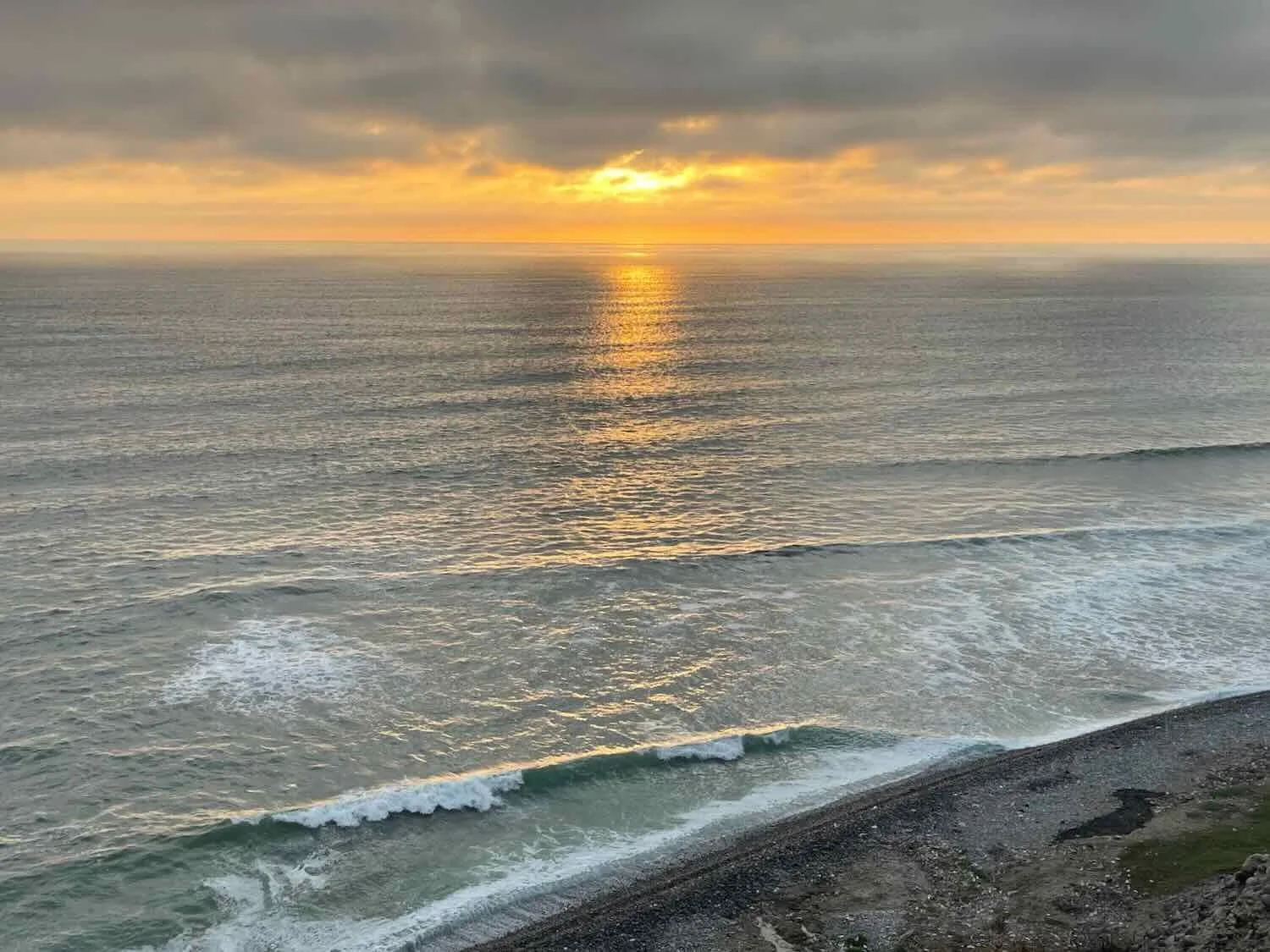 Sunset over the Pacific Ocean, seen from the cliff-top overlook. Biosol Ecocamp, Herbay Bajo, Pan-American Highway, Lima Department, Peru. Copyright © 2019-2026 Pedals and Puffins.
