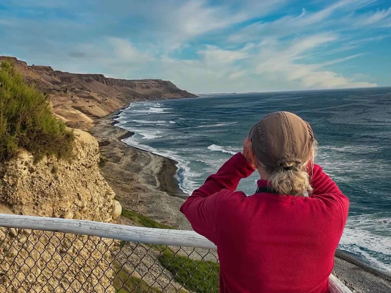 Scanning the shoreline from the cliff-top overlook. Biosol Ecocamp, Herbay Bajo, Pan-American Highway, Lima Department, Peru. Copyright © 2019-2026 Pedals and Puffins.