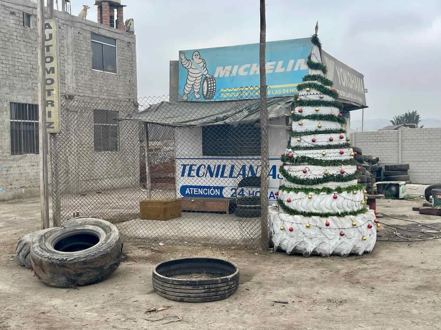 A roadside tire repair shop had its own way of decorating for the upcoming Christmas holiday. Cerro Azul, Pan-American Highway, Lima Department, Peru. Copyright © 2019-2026 Pedals and Puffins.