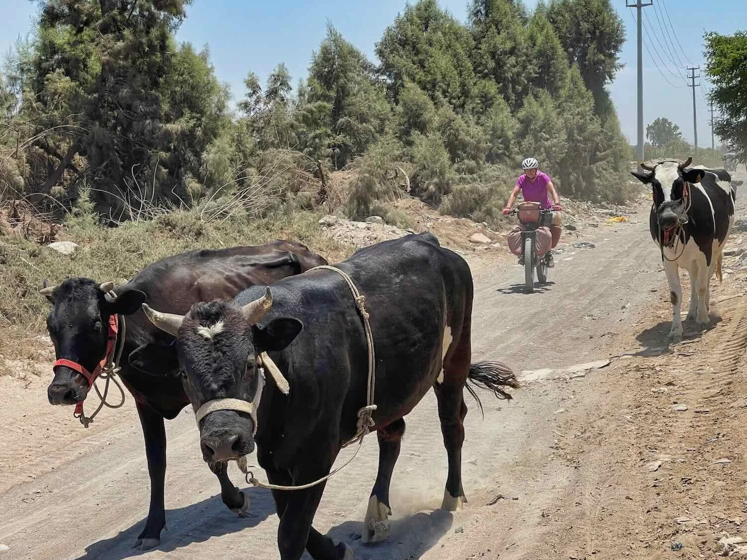 However, the asparagus fields didn’t last. Soon we were riding through what appeared to be the city dump. The road was bordered by hills of steaming garbage that didn’t smell very good under the afternoon sun. In addition, our path was littered with pieces of trash. Most of it was soft paper or fabric. But there definitely were shards of metal and glass half-buried in the sand that had the potential to tear a hole in our tires. We were very happy to make it through that section without getting any flats.