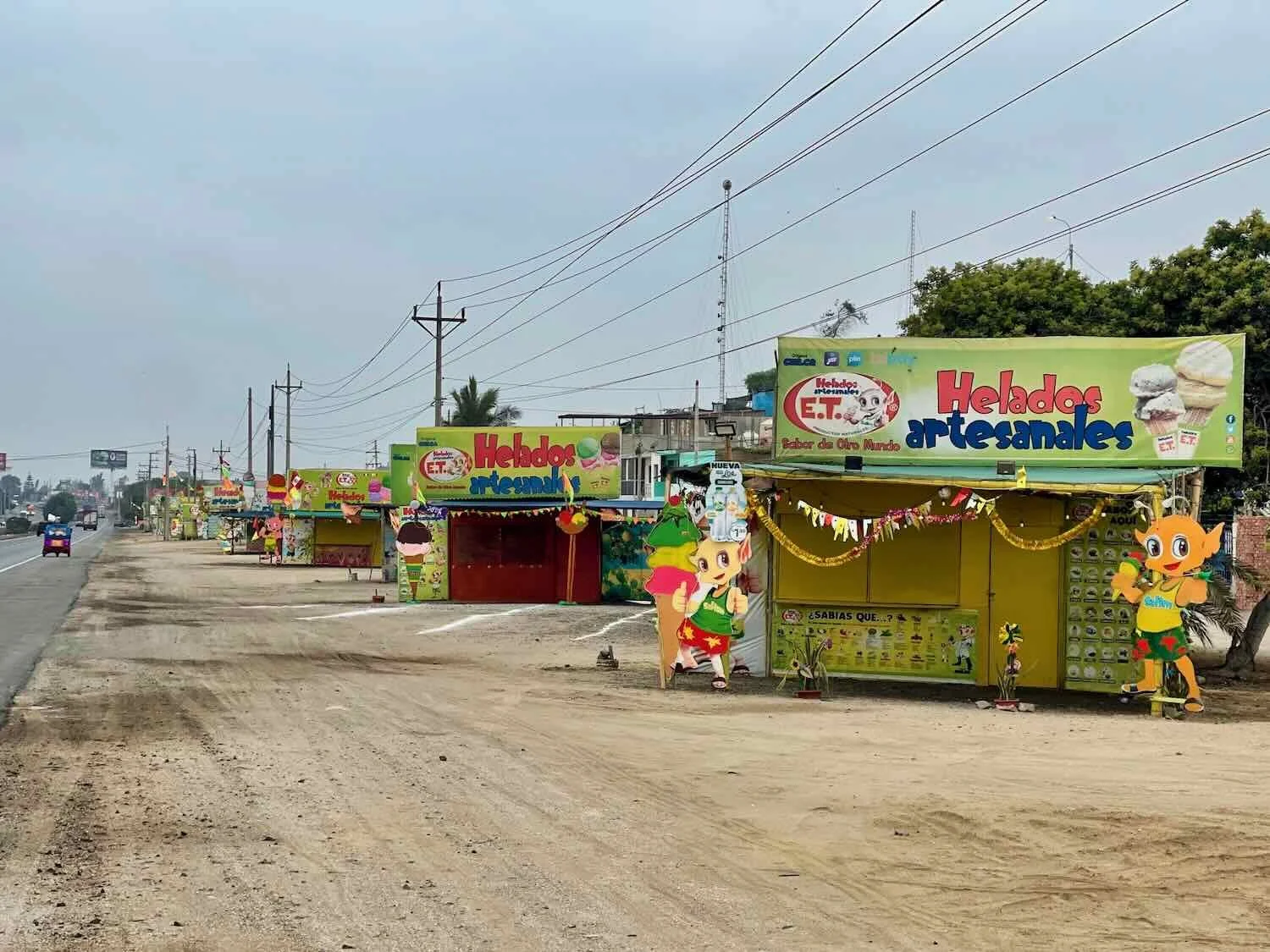 On this stretch of the highway leading into Lima there were easily a hundred little stalls, all selling E.T. Ice Cream - with the image of the little alien mascot plastered everywhere. Unfortunately, none of the shops were open when we passed. It was unfortunately too early in the morning for the stands to be open. Chilca, Pan-American Highway, Lima Department, Peru. Copyright © 2019-2026 Pedals and Puffins.