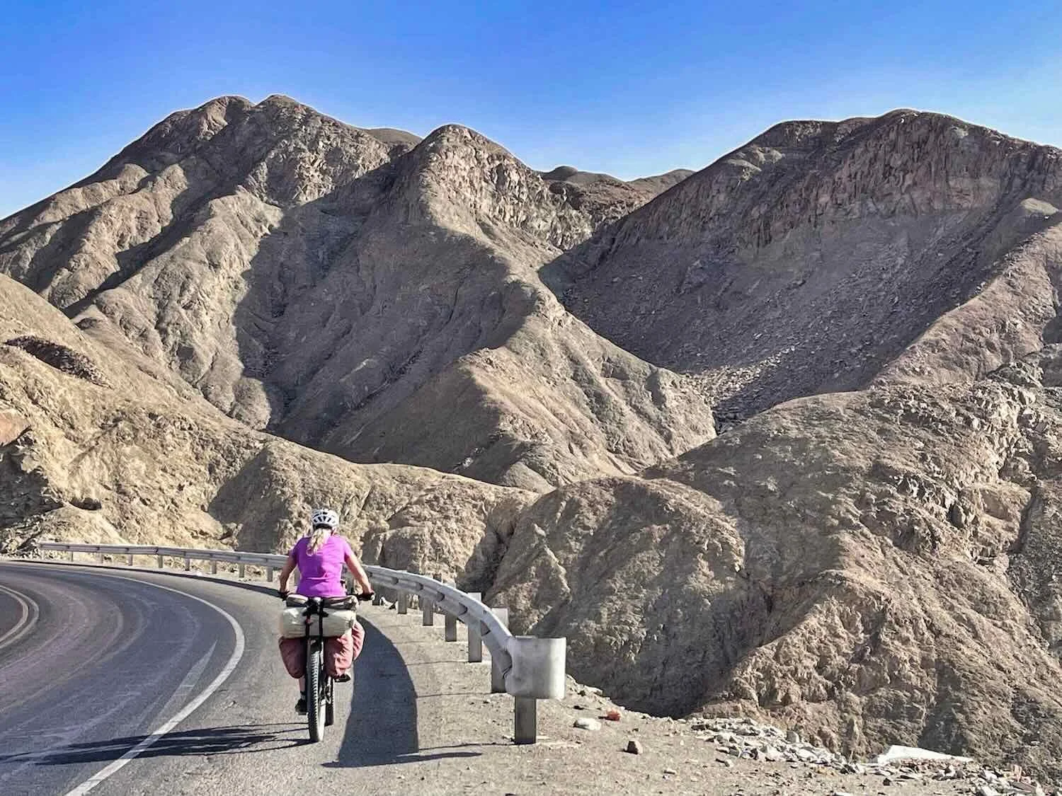 Before long we left the plantations and fields behind. For the next hour we would work our way gradually up to another high pass in the desert. These hills were particularly steep. Fortunately for us, a series of switchbacks and hairpin turns made the climbing easier. We just took our time, winding back and forth among the gravelly hills.