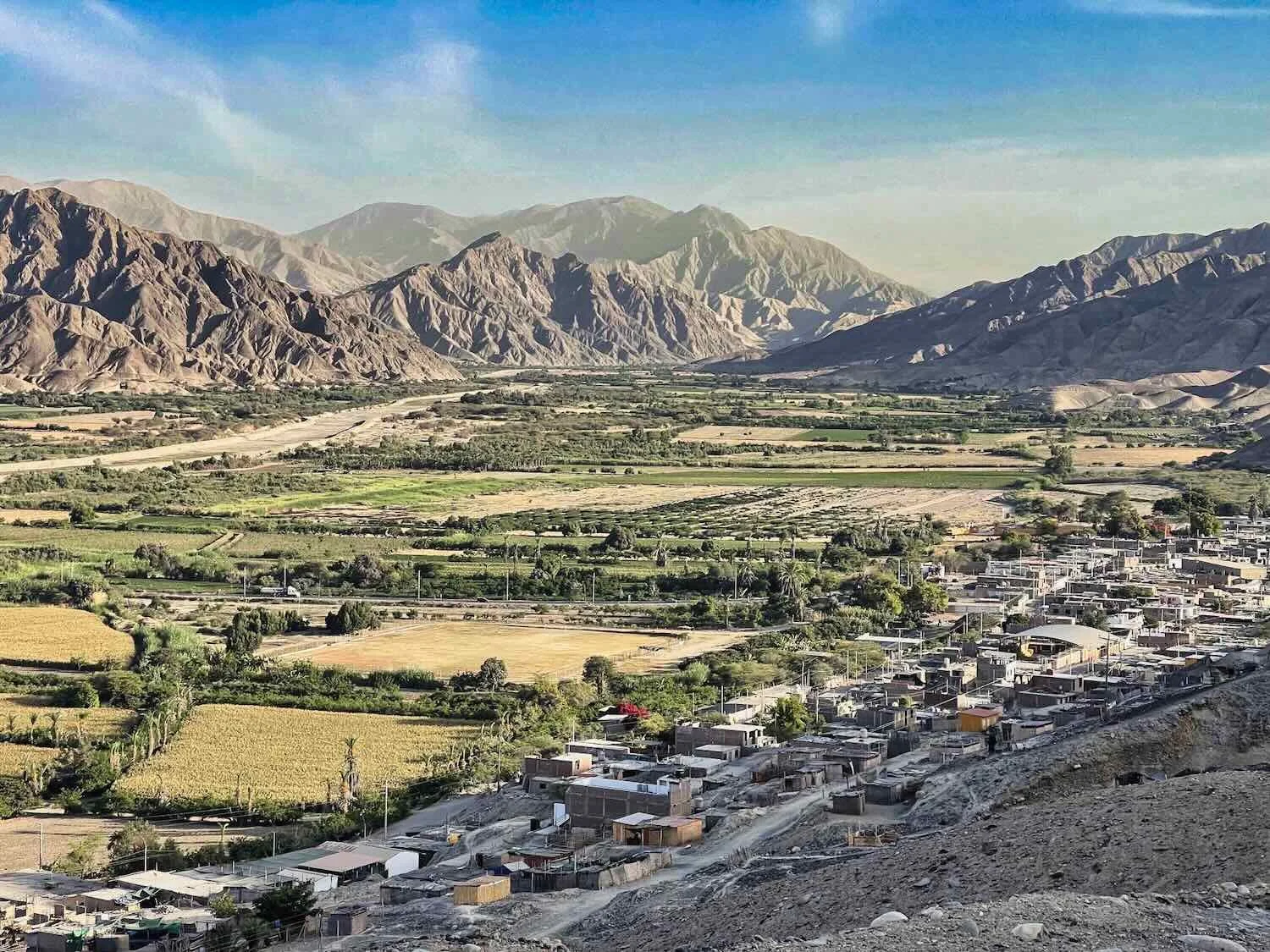 A town hugged the foothills at the side of the river valley, leaving as much of the floodplain as possible for growing irrigated crops. Río Grande, Pan-American Highway, Ica Department, Peru. Copyright © 2019-2026 Pedals and Puffins.