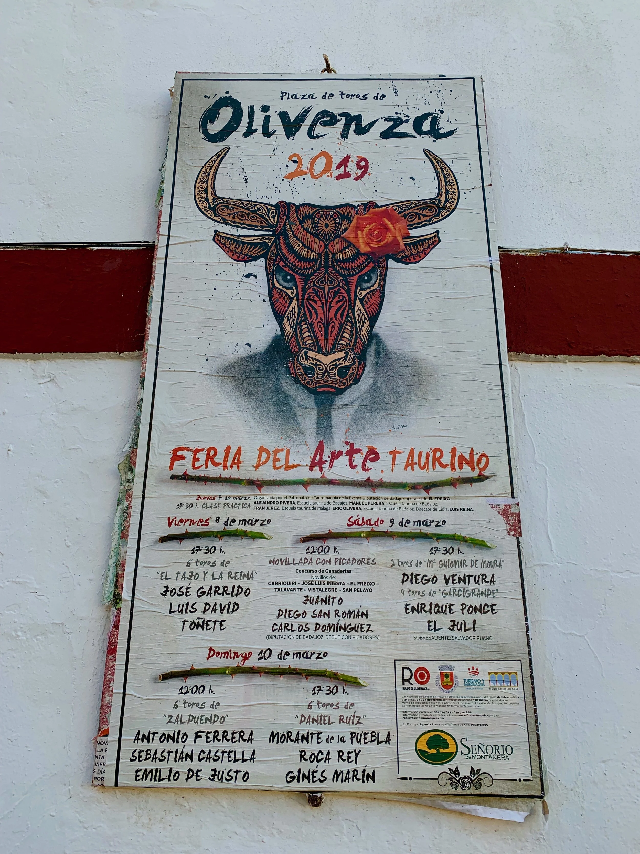 A poster announcing the bullfighting schedule for 2019 in Zafra, Spain. Many smaller towns also had bull rings. Copyright © 2018-2019 Pedals and Puffins.