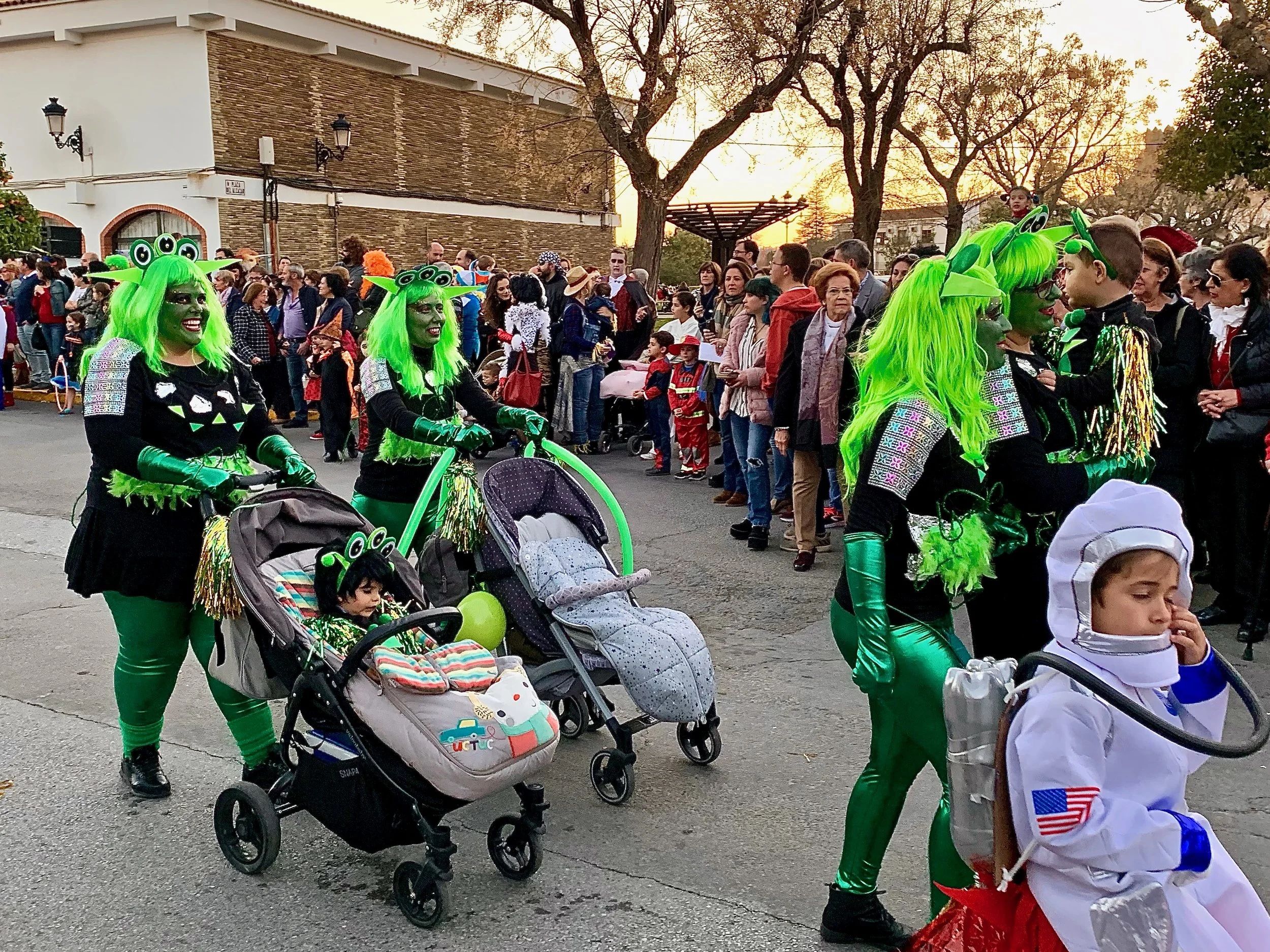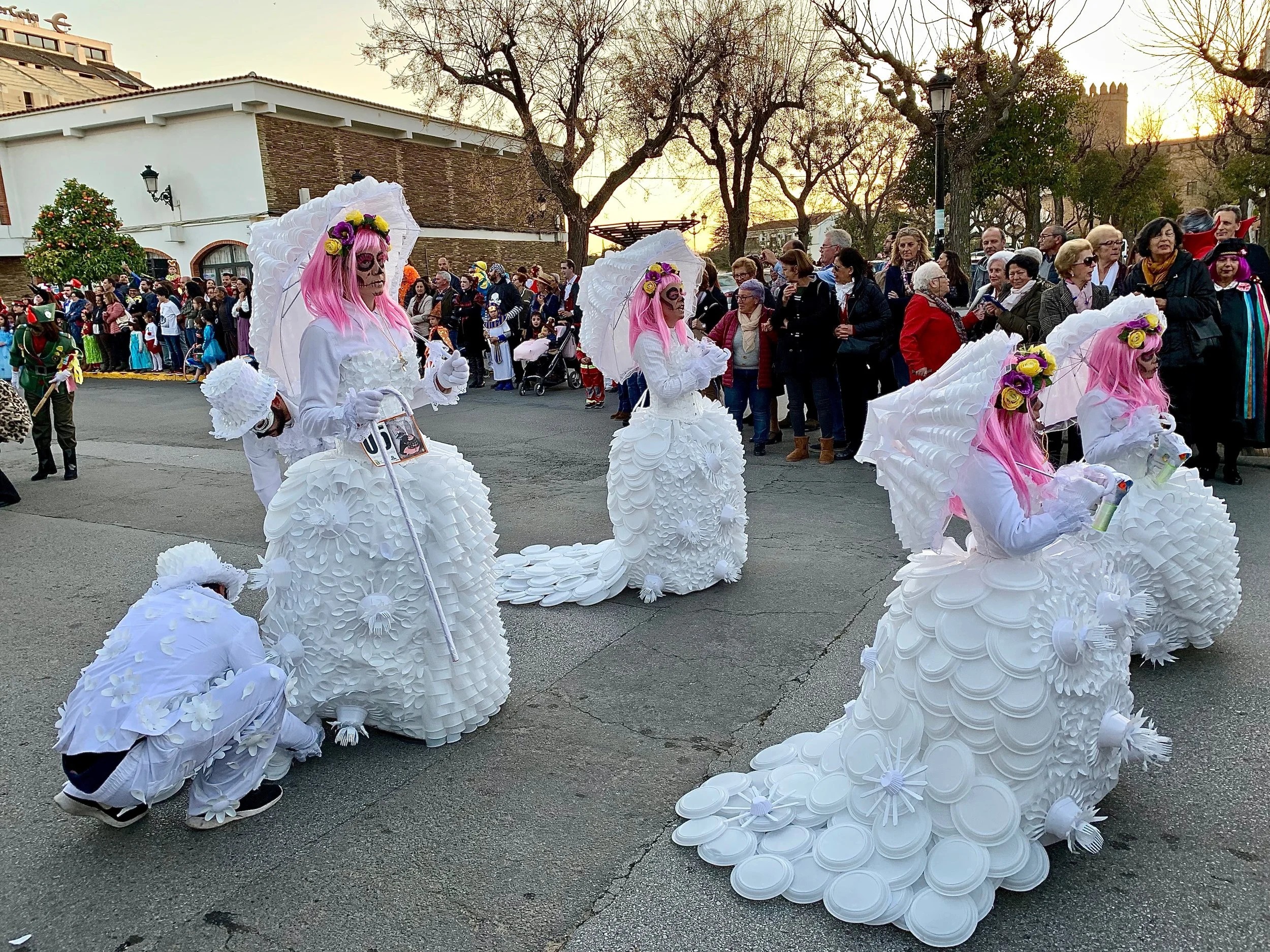 In Zafra, we joined the crowds cheering the costumed Comparsas (local clubs) as they paraded slowly along a winding route through the heart of the city. This was not Mardi Gras in Rio or New Orleans, where semi-professional teams dazzle the crowd. It was much more of a home-grown event. All of the costumes were hand-made. We saw astronauts and pirates, honeybees with their bee-keepers, and several teams with environmental themes (like water or forests). The whole parade was very family-oriented. The Comparsas included their children in the parade - pushing strollers and corraling energetic toddlers - in miniature versions of their parent’s costumes. And most of the kids on the sidelines were dressed up as well. We saw lots of pint-sized superheros, animals like tigers and frogs, and princesses.