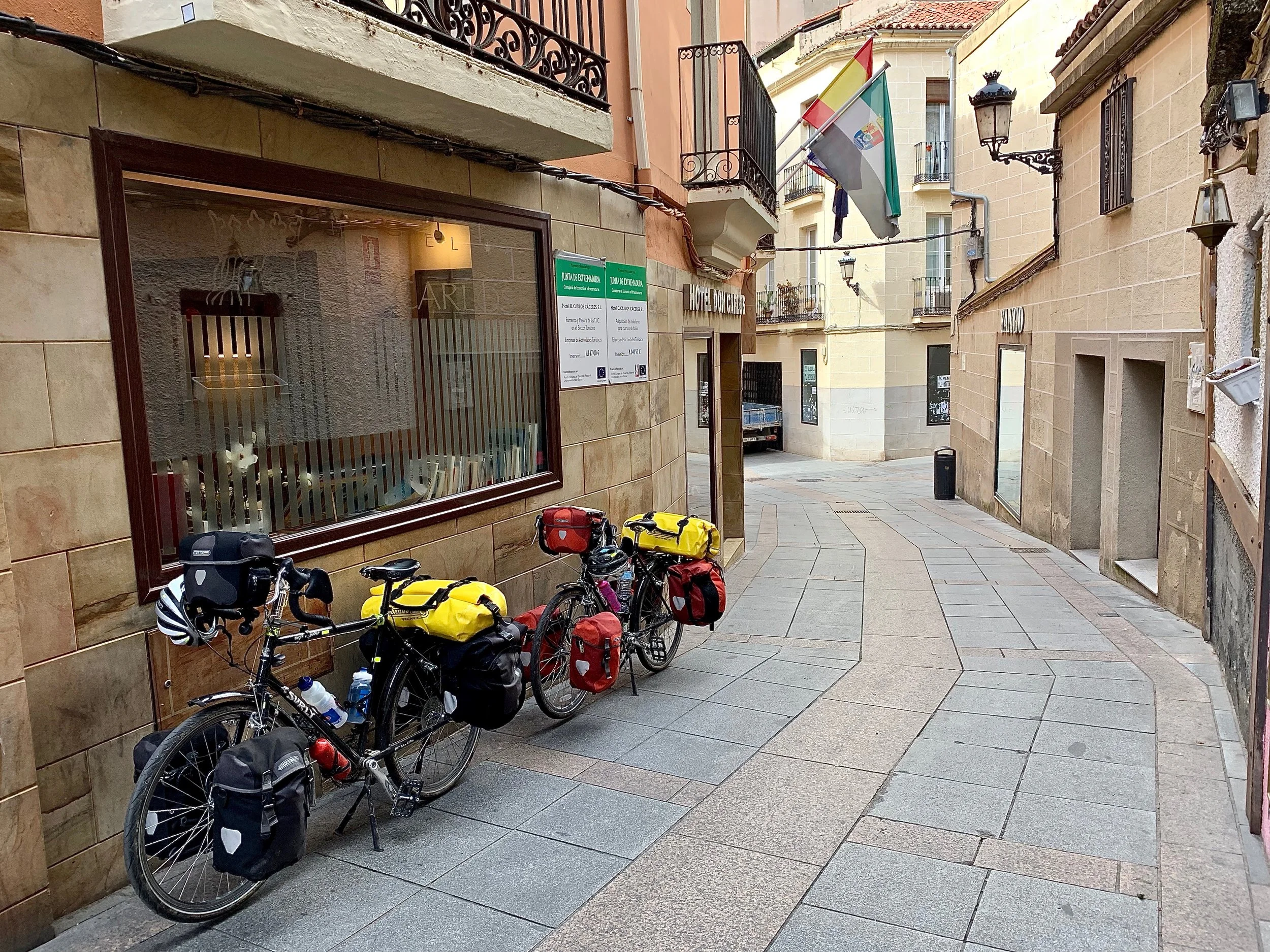 Once we reached Cáceres, we had a hard time locating our desired hotel. On this part of the Camino de Santiago, the foot path and the bike route are not very close to each other, so the albergue (pilgrims’ hostel) was not convenient to our ride. We decided to check into a hotel right along our trail. It was discreetly located on a pedestrian-only alley in the old part of the city, which made it quite difficult to find. After taking a couple of wrong turns, and backtracking a little bit, we finally found our spot for the night.