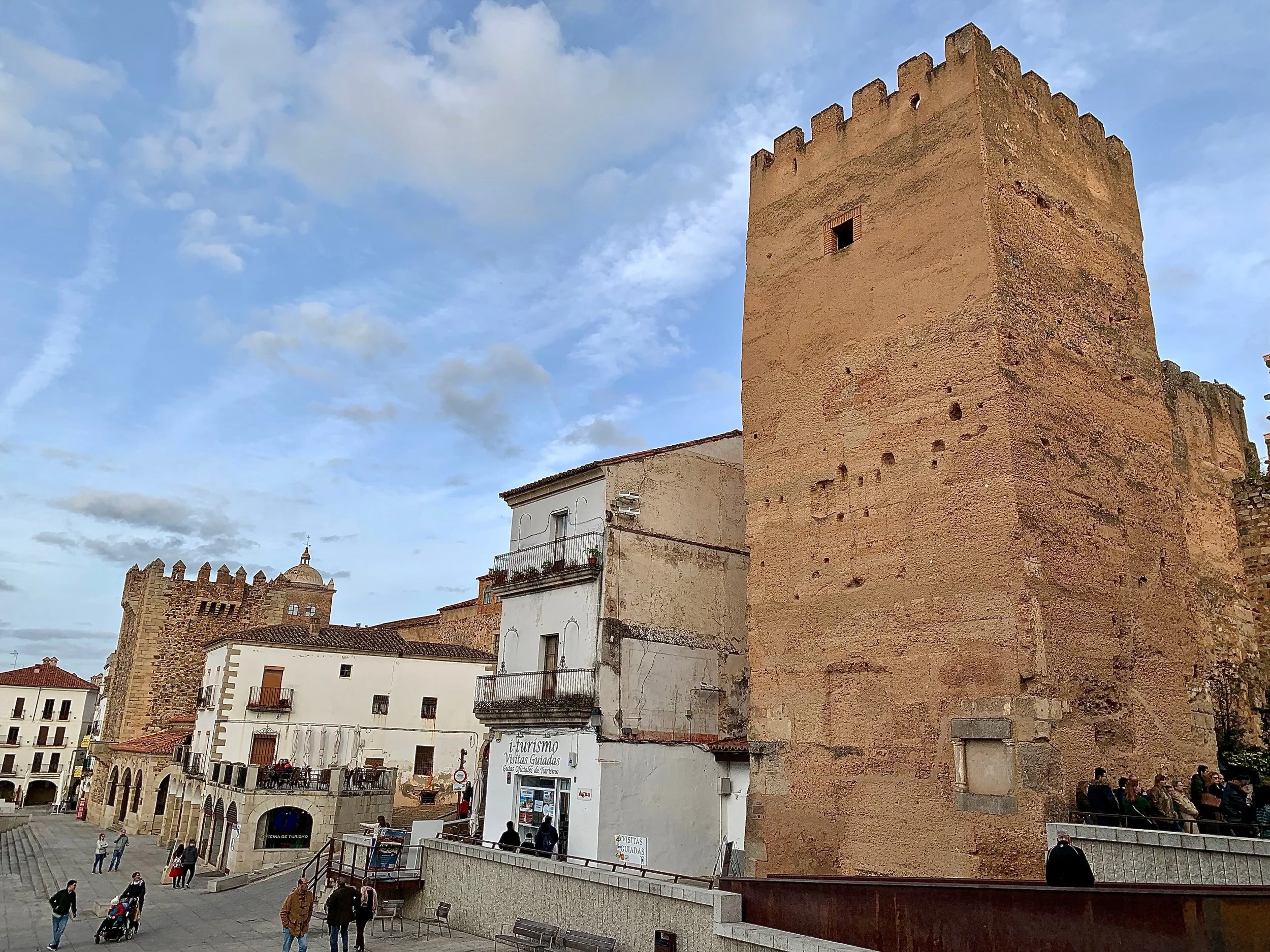 The central plaza in Cáceres is lined with imposing stone towers, including the Torre de Bujaco (on the left), which played a central role in the city’s struggle between Christian and Arab control. Copyright © 2018-2019 Pedals and Puffins.