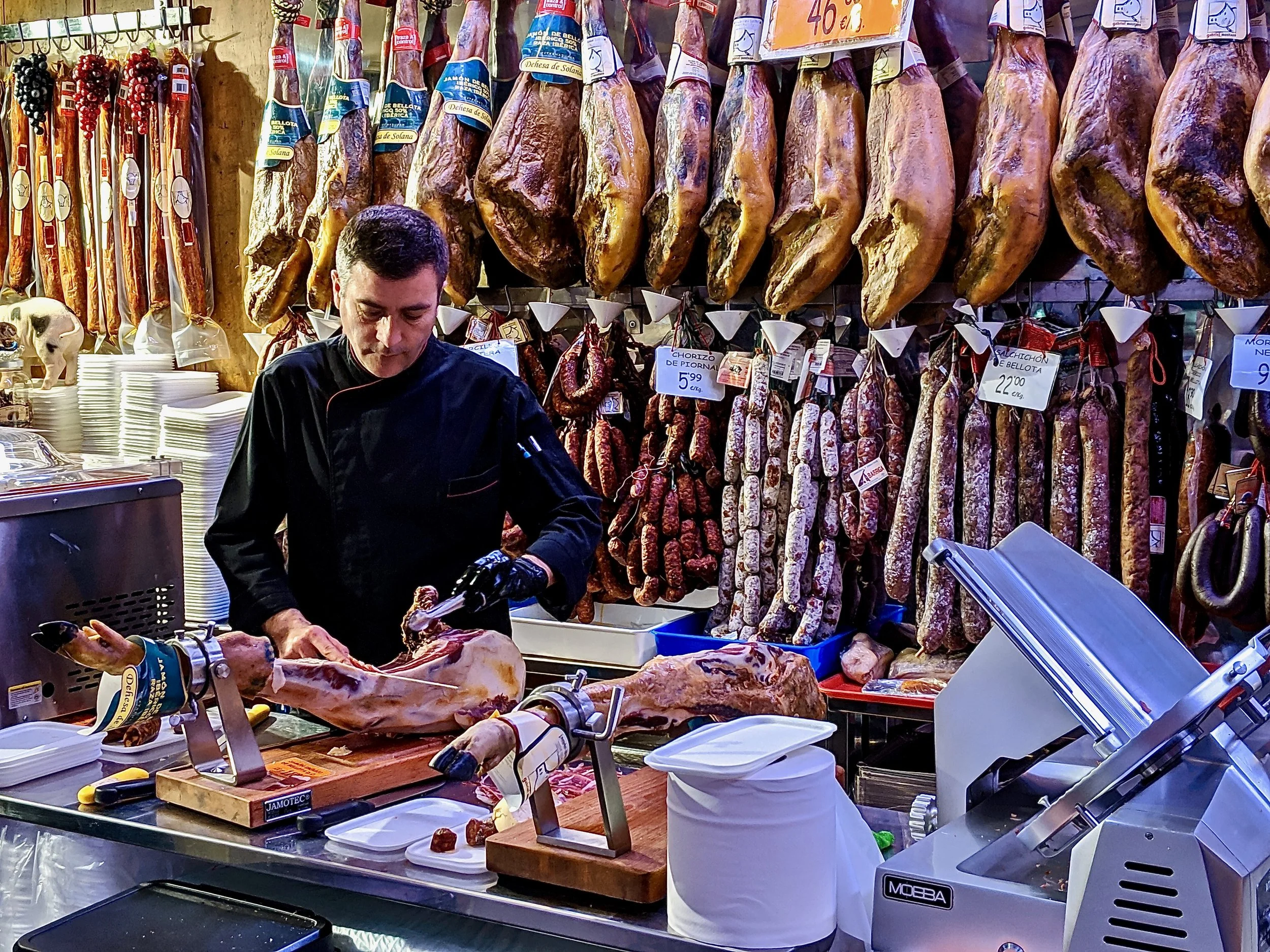A butcher delicately carves paper-thin slices of Iberian Ham for sale in Cáceres, Spain. Iberian Ham is a big deal in this region. This is not ordinary ham, but ham from pigs that are specially bred and come from a relatively small local area, after having spent most of their lives as free-range animals eating chestnuts, olives and acorns. When they come to their demise, the meat is then cured for 1-2 years before being sold at high prices. Copyright © 2018-2019 Pedals and Puffins.