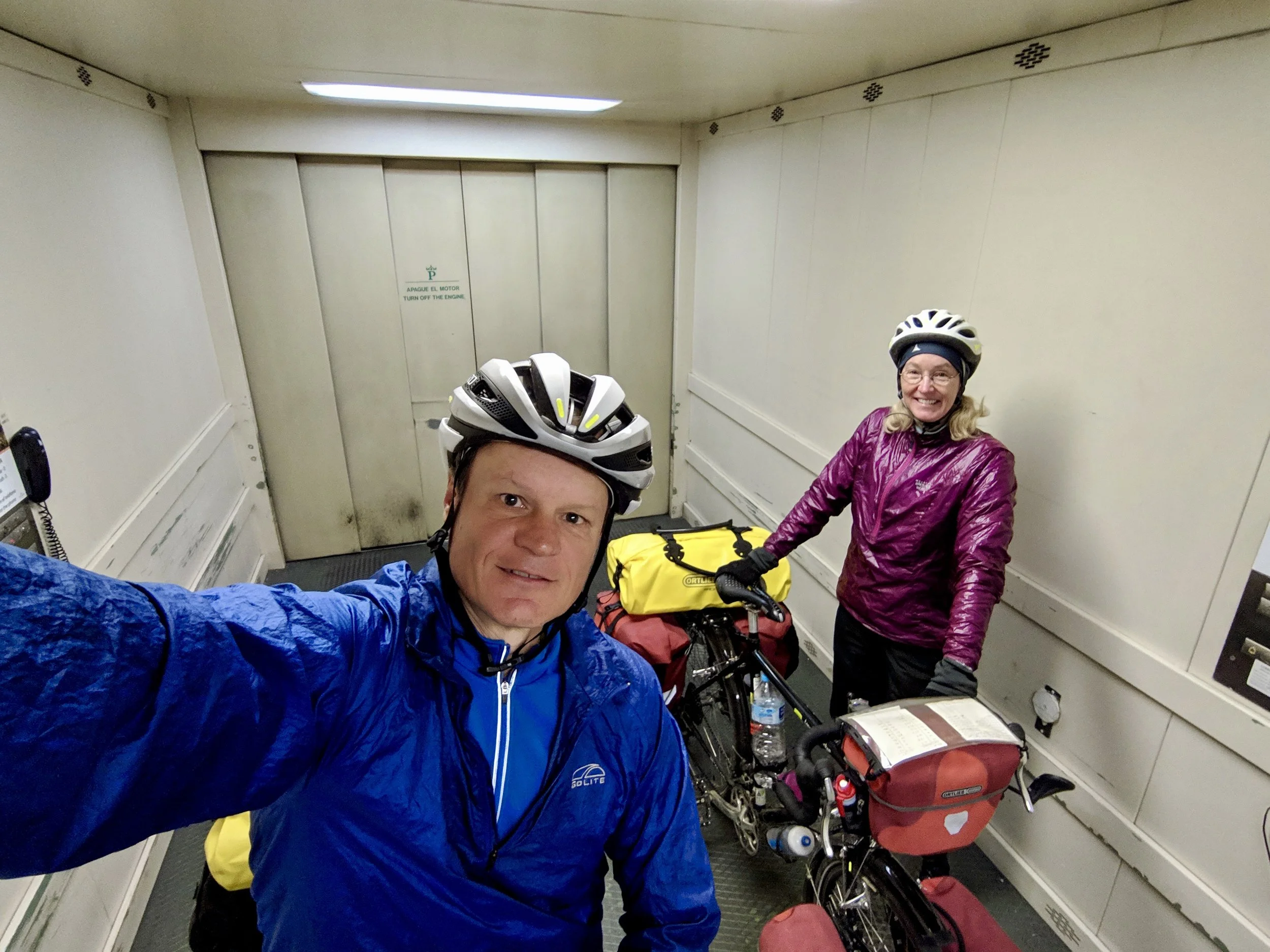 Taking our bikes up to the posada’s parking garage, in the car elevator. What a trip! Copyright © 2018-2019 Pedals and Puffins.