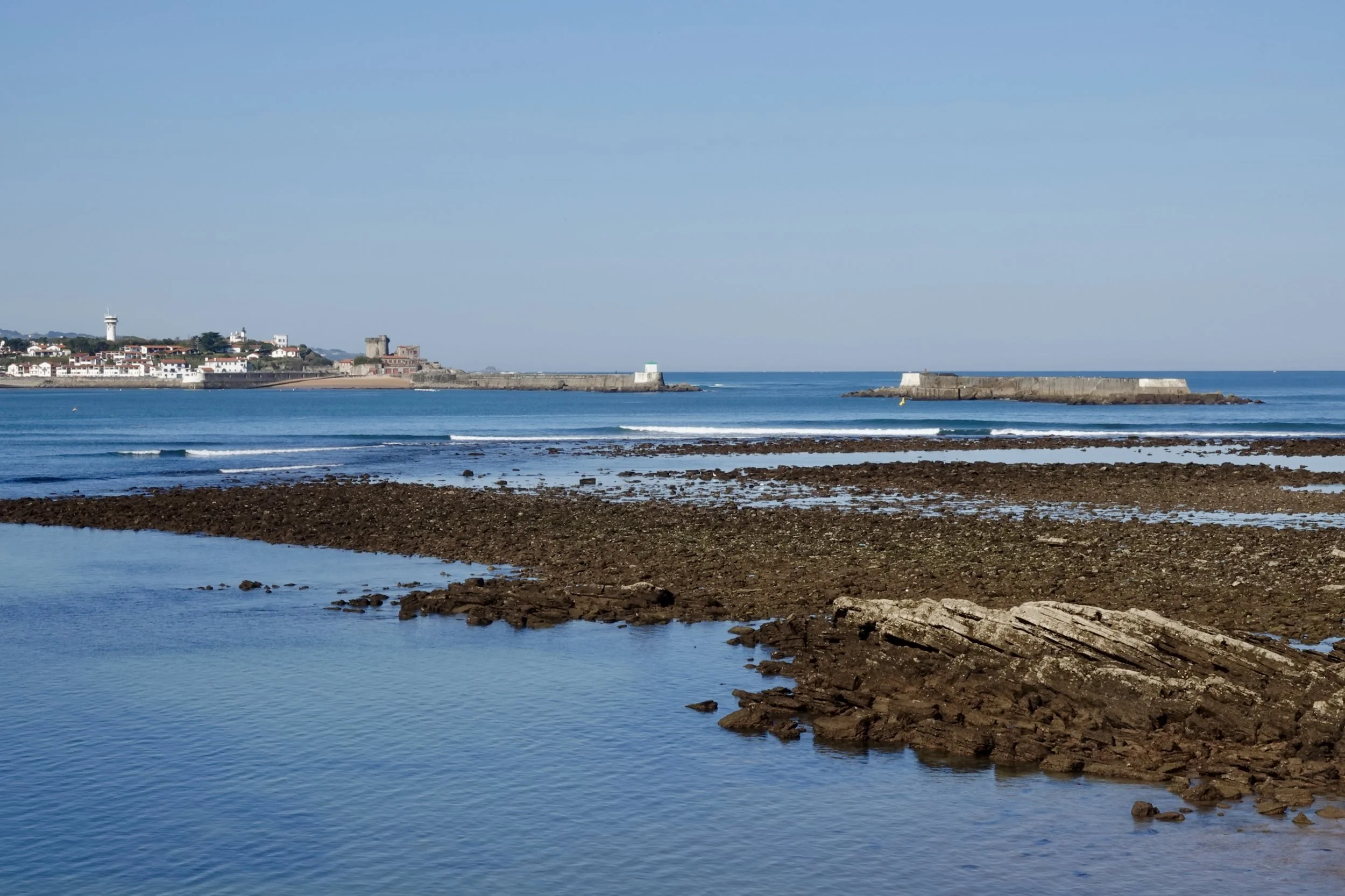 The dazzlingly blue water of the Atlantic Ocean, at the mouth of La Nivelle River. Saint-Jean-de-Luz, France. Copyright 2018-2019 by Pedals and Puffins.