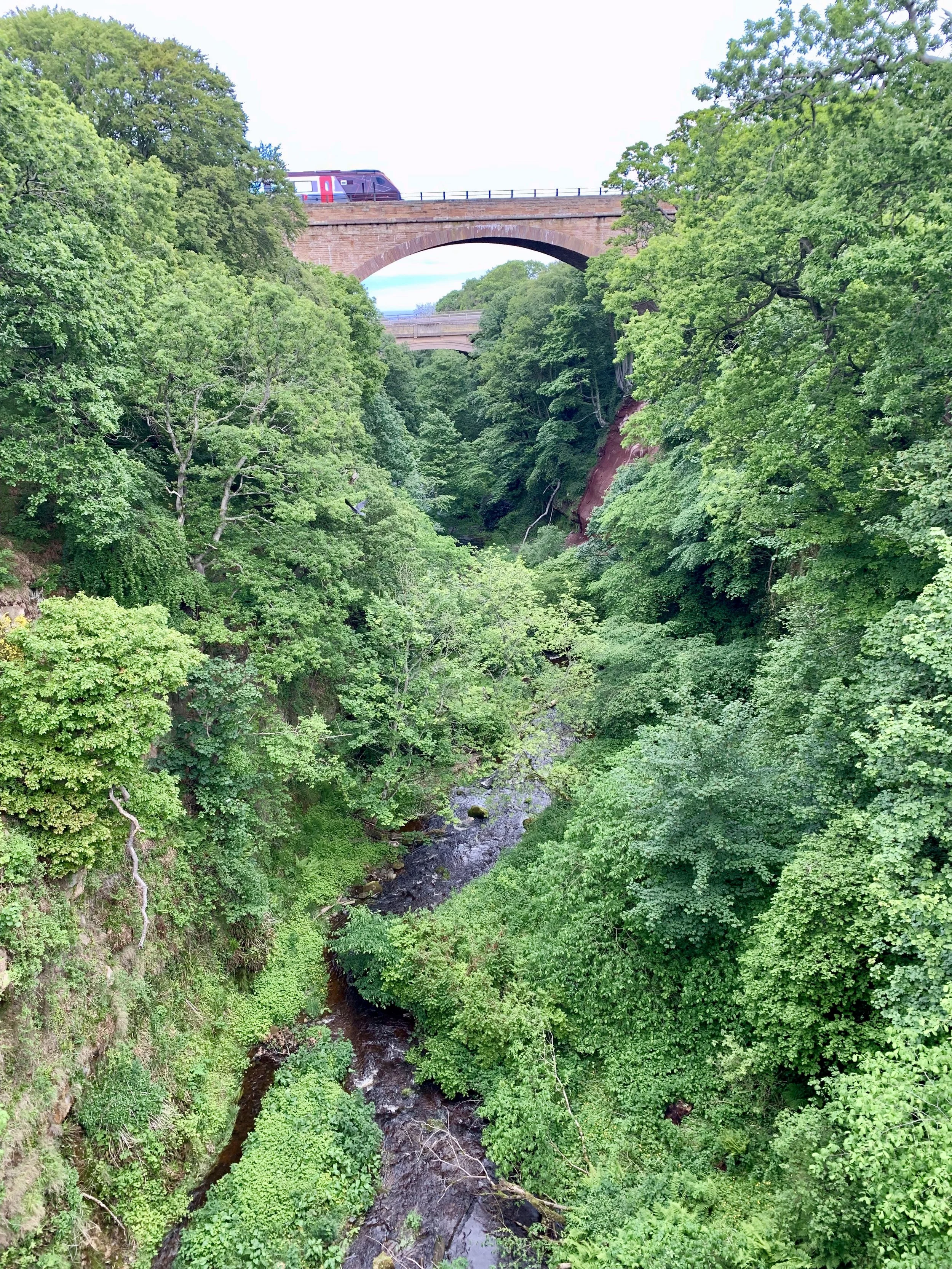 View into Dunglass Burn Gorge, from the wonderful bridge that crosses it. Dunglass, Scotland, UK. Copyright © 2018-2019 Pedals and Puffins.