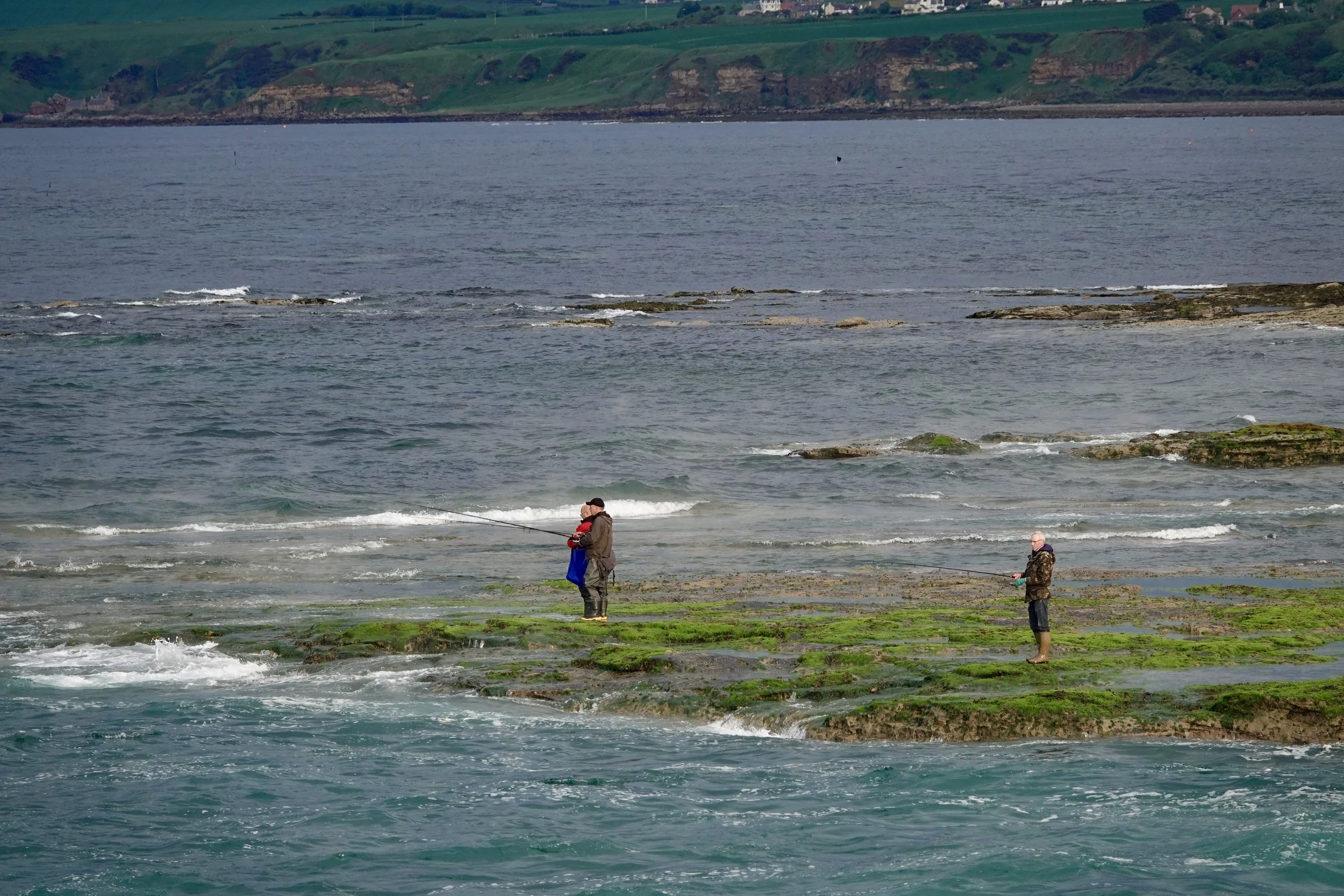 Fishermen at the warm water outlet from the Thorntonloch Nuclear Power Plant. Thorntonloch, Scotland, UK. Copyright © 2018-2019 Pedals and Puffins.