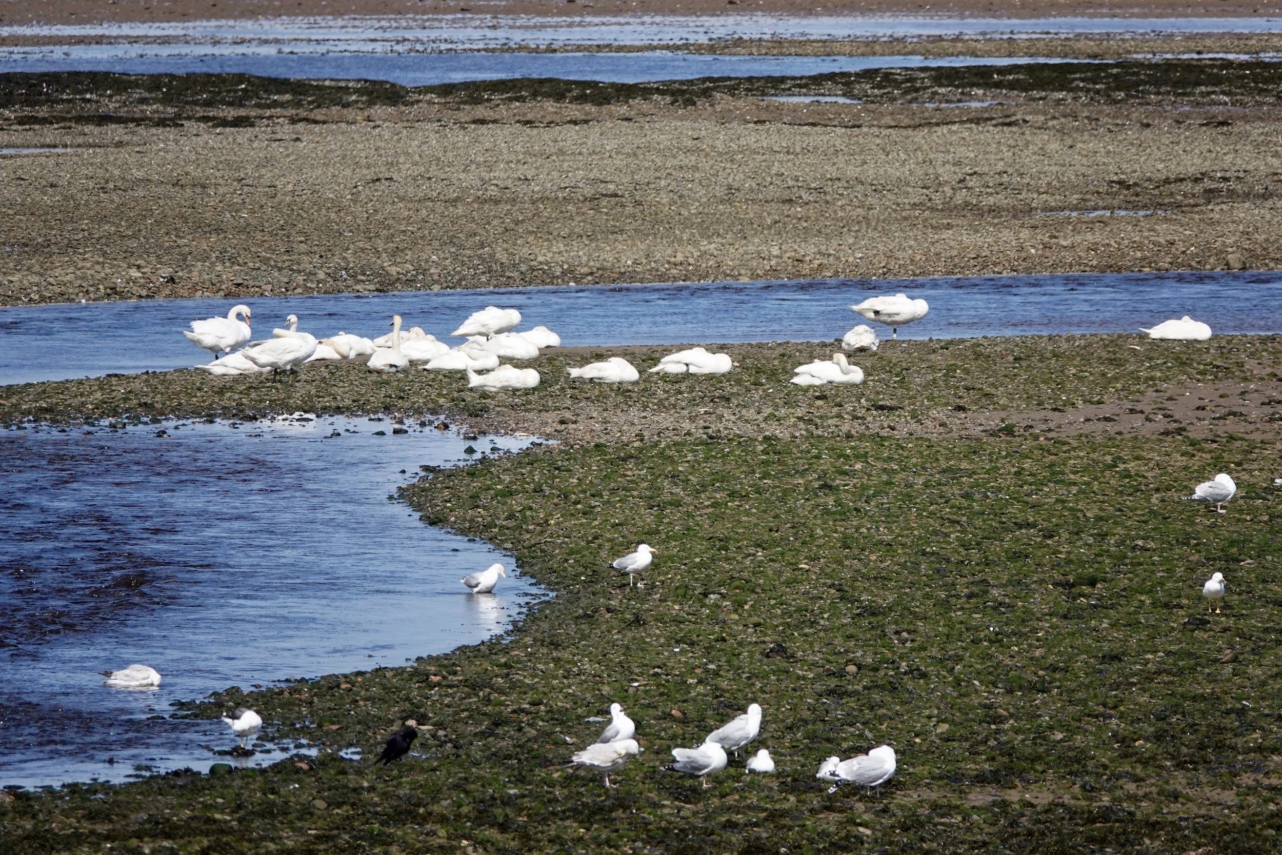 Mute Swans and seagulls in the Firth of Forth. Scotland, UK. Copyright © 2018-2019 Pedals and Puffins.