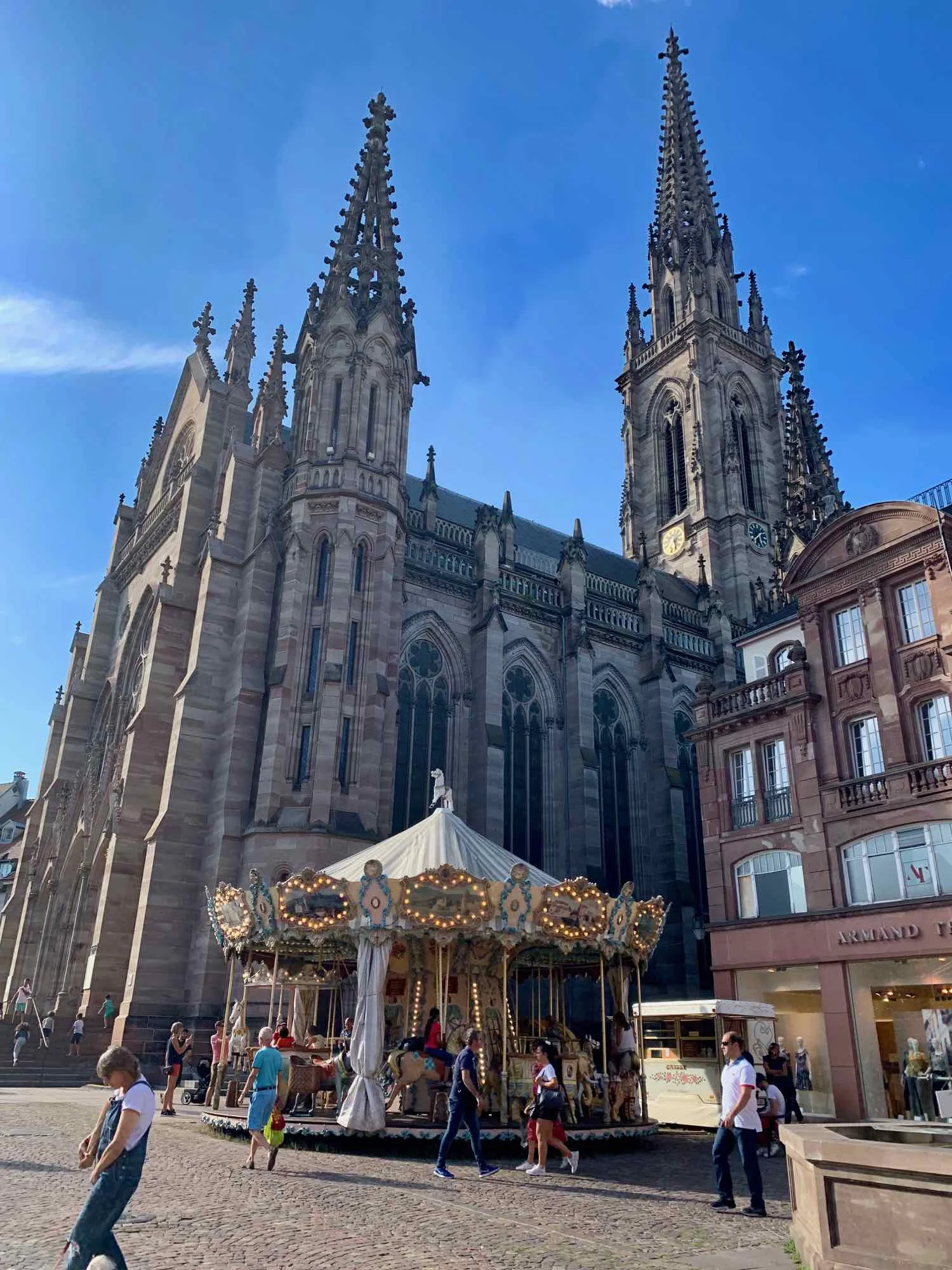 Carousel and the Church of Saint Etienne, Mulhouse, France. Copyright © 2018-2019 Pedals and Puffins.