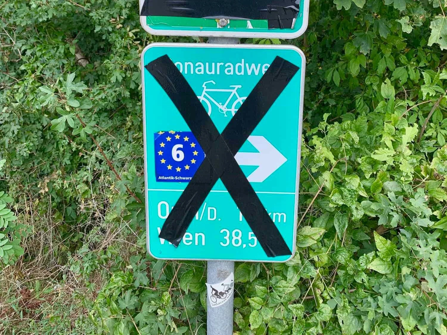On the other side of the barrier we saw a big black “X” over the EuroVelo 6 sign. They clearly didn’t want bicycles going that way.