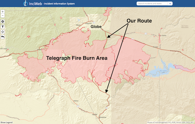 Map of the area burned by the 2021 Telegraph Fire near Globe, Arizona. The fire burned nearly 200,000 acres (80,000 ha) before being brought under control in early July 2021. Image courtesy of Inciweb.NWCG.gov (National Wildfire Coordinating Group).