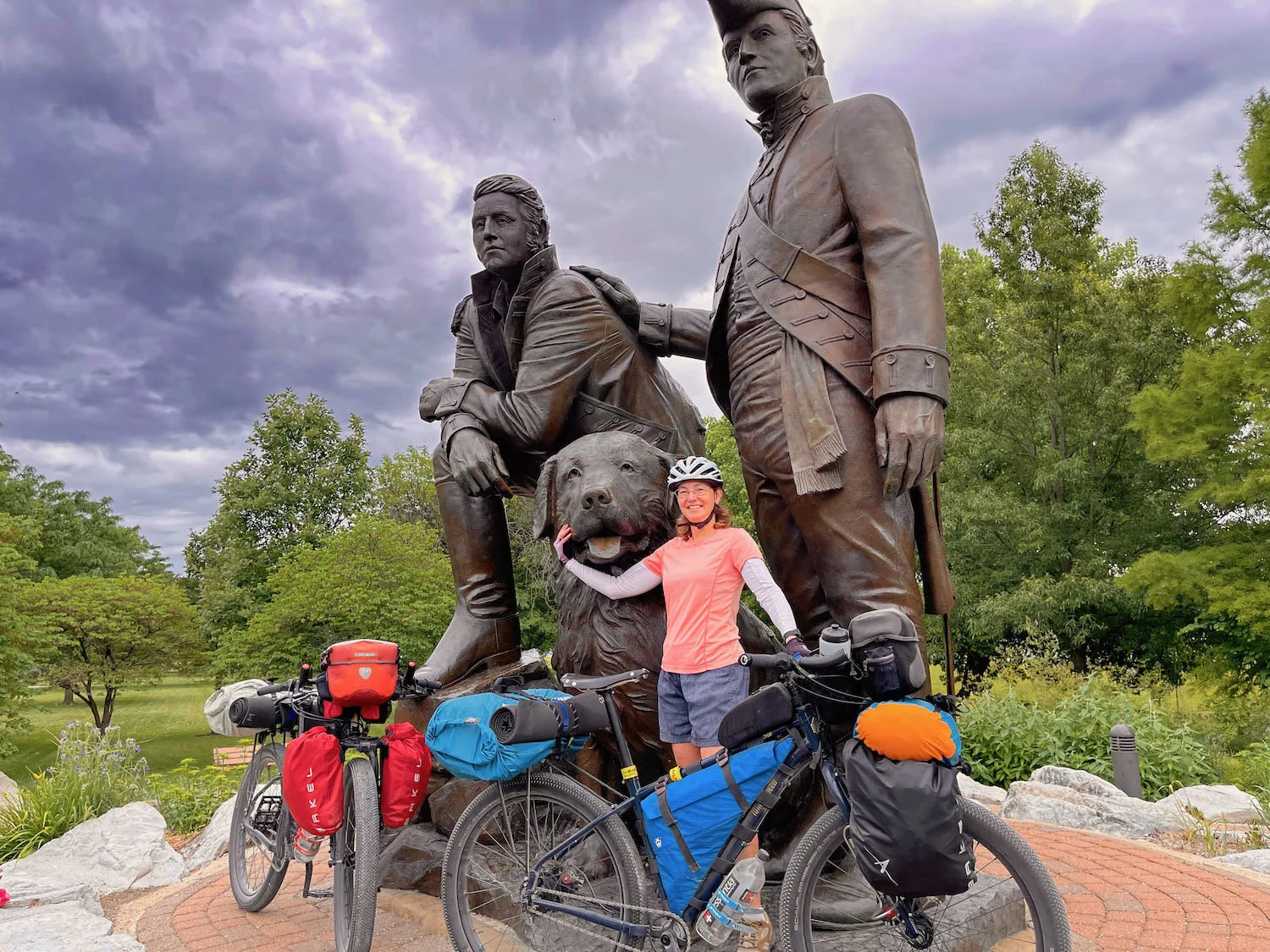 Four explorers: Captain Meriwether Lewis, Lt. William Clark, their Newfoundland dog (Seaman), and PedalingGal. Ready for adventure. St. Charles, MO, USA. Copyright © 2019-2021 Pedals and Puffins.