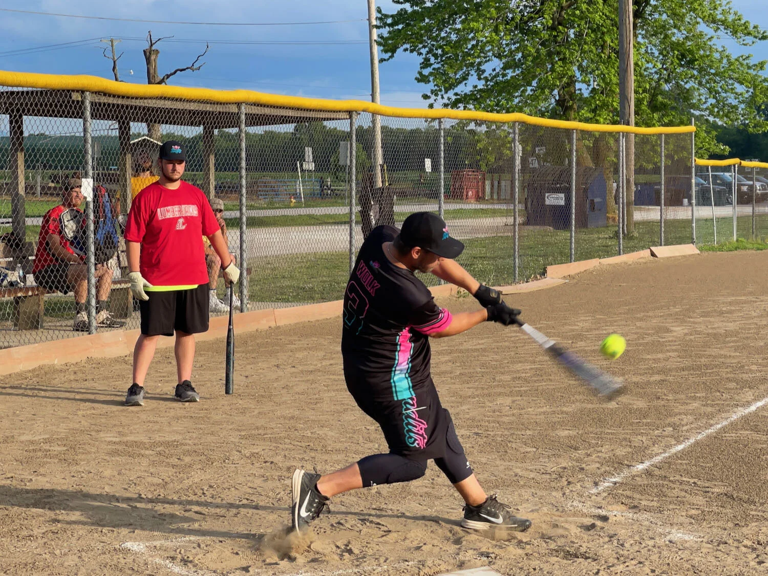 A slugger swings for the fences at the town softball field. The men’s softball league provided our evening’s entertainment. Marthasville, MO, USA. Copyright © 2019-2021 Pedals and Puffins.